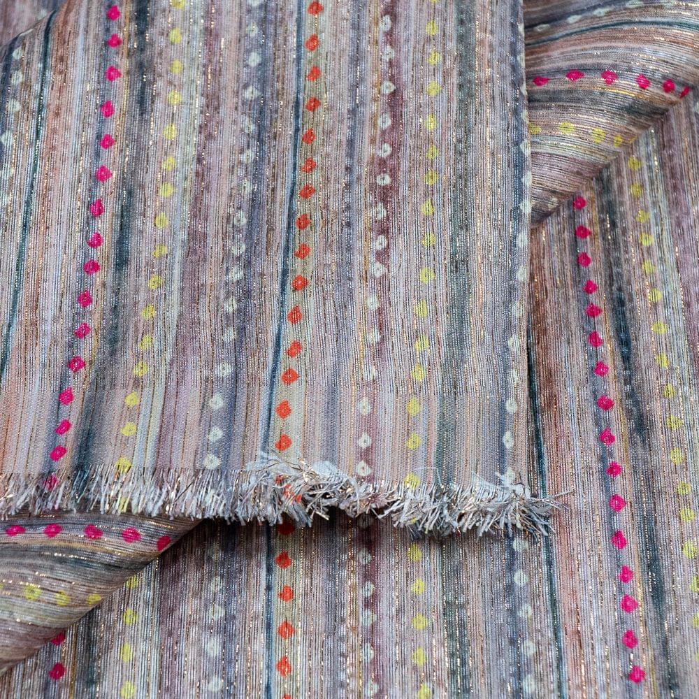 Chanderi is weave which gives fabric a stiffer but elegant look and over and above this fabric have zari woven along with cotton silk to create this fabric. So We call it chanderi zari and Digitally printed with ethnic Prints. This fabric can be used to make dress, sherwani, kurta and choli. Can be mixed and matched with other similar prints too. SKU:10022104