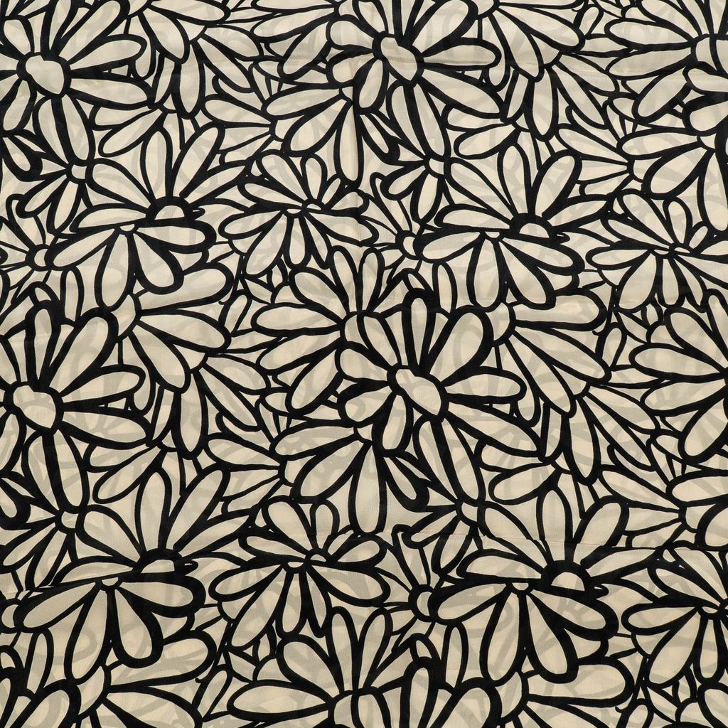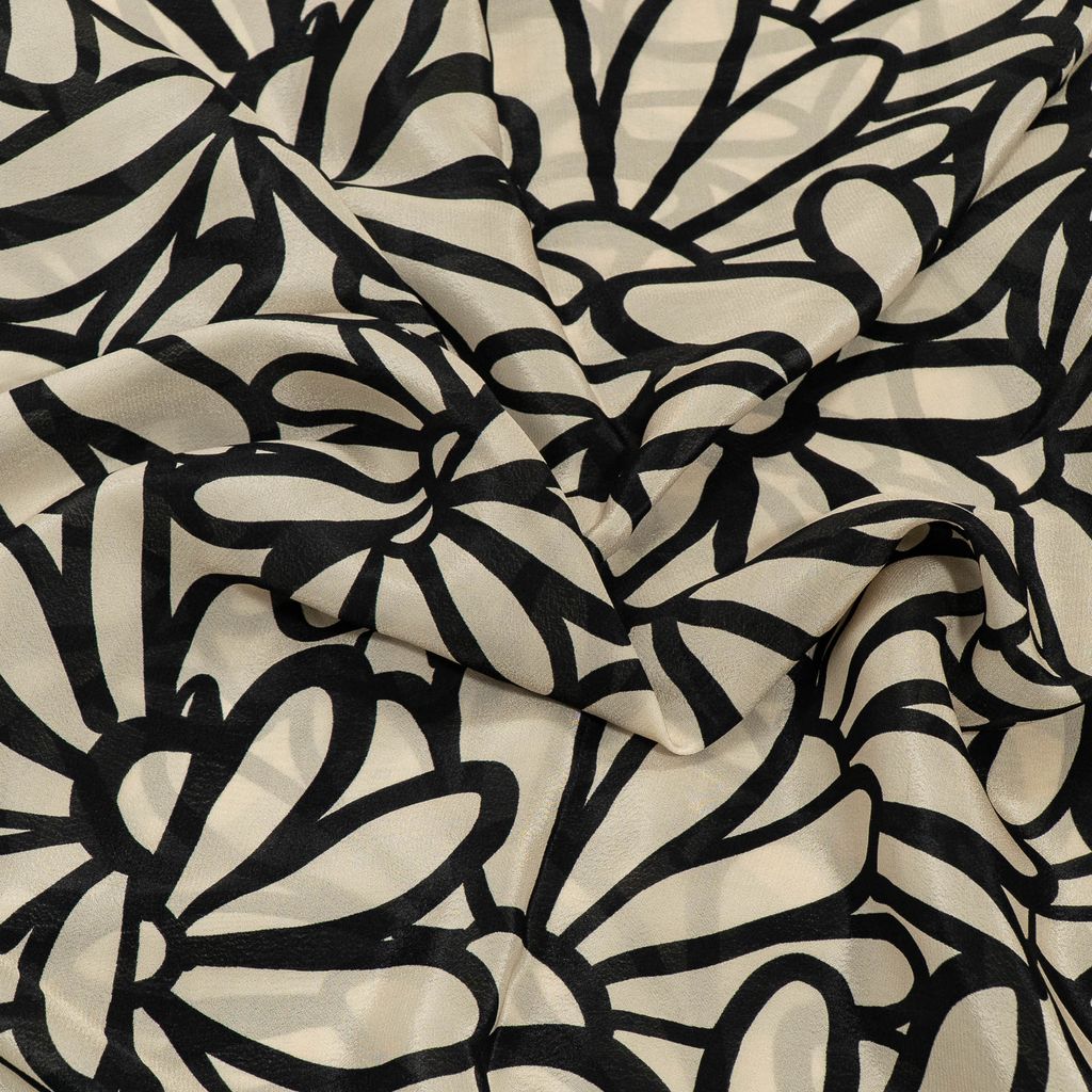 Add effortless elegance to your designs with this Viscose Crepe Digital Printed Fabric, featuring a refined monochrome pattern that blends modern minimalism with timeless style. The fabric showcases repeating floral-inspired geometric motifs, arranged in a balanced layout that creates a clean and sophisticated visual appeal.