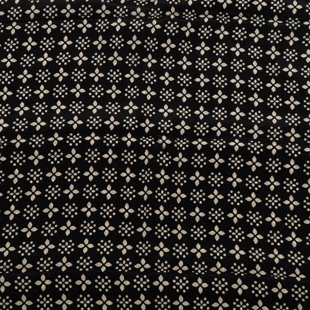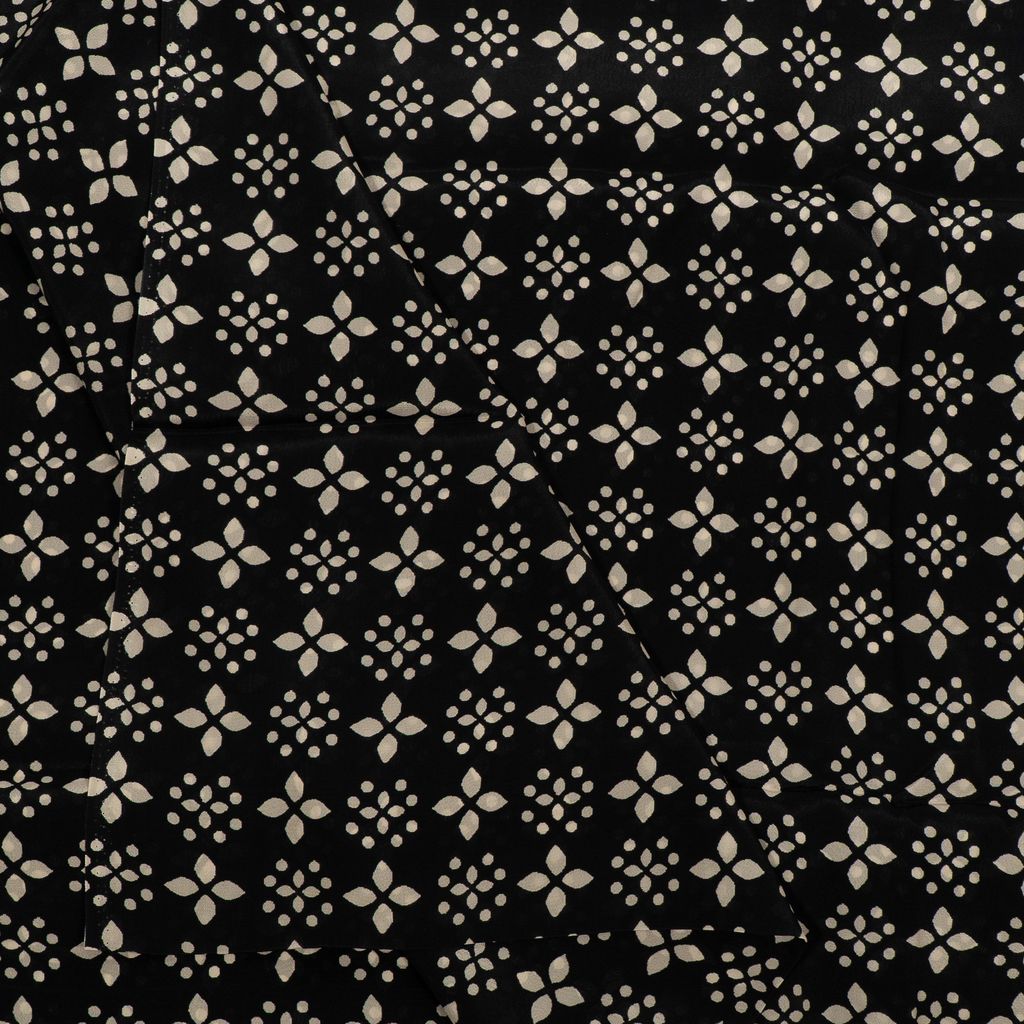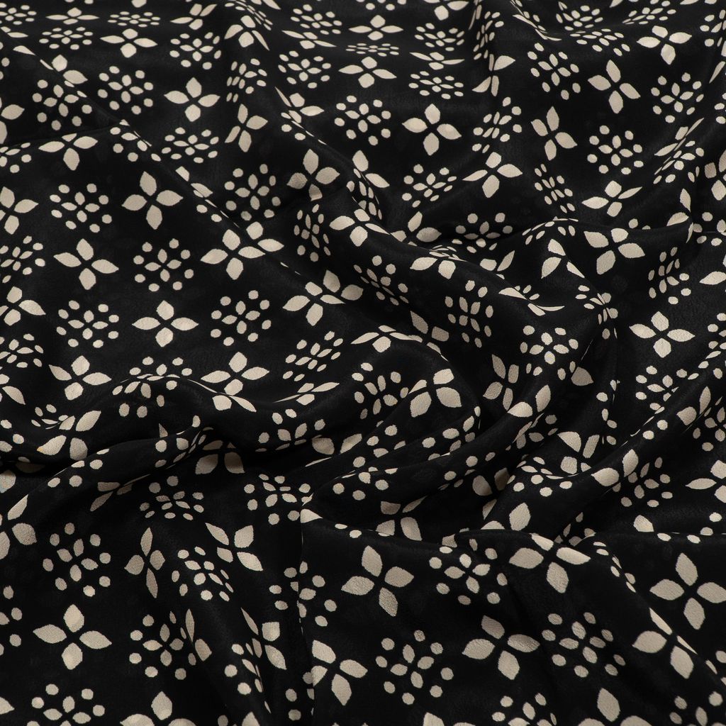 Add effortless elegance to your designs with this Viscose Crepe Digital Printed Fabric, featuring a refined monochrome pattern that blends modern minimalism with timeless style. The fabric showcases repeating floral-inspired geometric motifs, arranged in a balanced layout that creates a clean and sophisticated visual appeal.