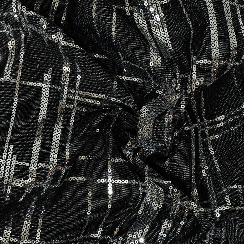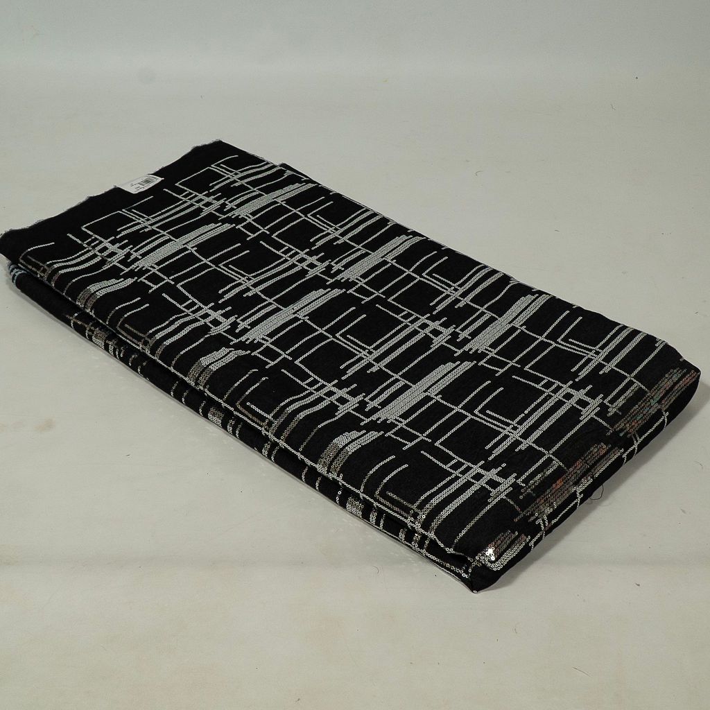 Add a modern twist to classic denim with our denim fabric embellished with dazzling sequin embroidery in a striking geometric pattern. This fabric brings together the rugged durability of denim with the shimmering elegance of sequins, making it ideal for fashion-forward designs. Perfect for creating bold jackets, skirts, or statement accessories, this fabric offers versatility while ensuring your creations stand out. The intricate geometric design adds a contemporary edge, making it a great choice for designers looking to combine structure with sparkle in their collections. SKU: 100243990, DNO: 3025