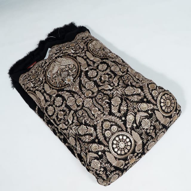 Indulge in timeless elegance with this luxurious black georgette fabric, intricately adorned with beige thread and antique zari embroidery. The regal design is further enhanced by delicately placed sequins that add a subtle shimmer, perfect for high-end ethnic wear.