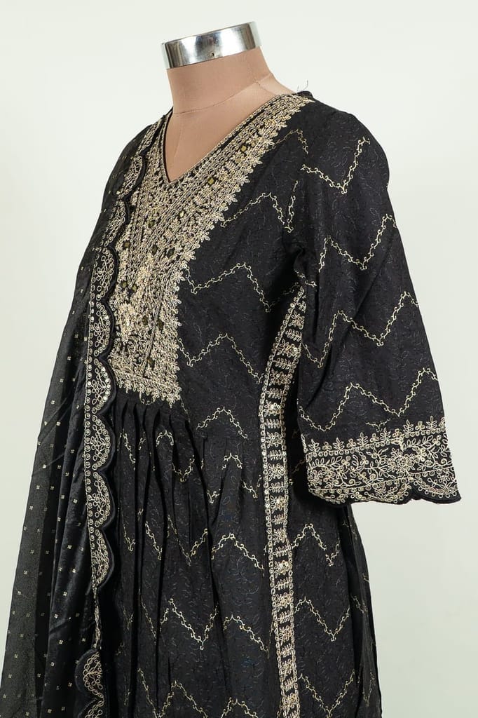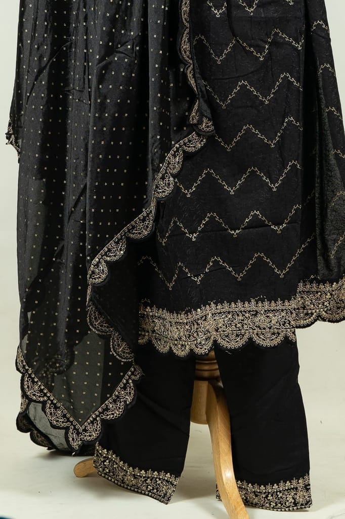 Drape yourself in elegance with this black-coloured ensemble. The rayon cotton shirt is beautifully adorned with intricate embroidery, perfectly complemented by the matching bottom. Completing the look is a chinon chiffon embroidered dupatta, creating a sophisticated outfit suitable for special occasions, exuding grace and charm.SKU:100235622 D.No.2