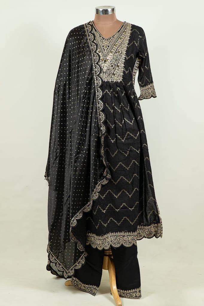 | Fabric Name | Black Color Rayon Cotton Embroidered Shirt with Bottom and Chinon Chiffon Embroidered Dupatta |