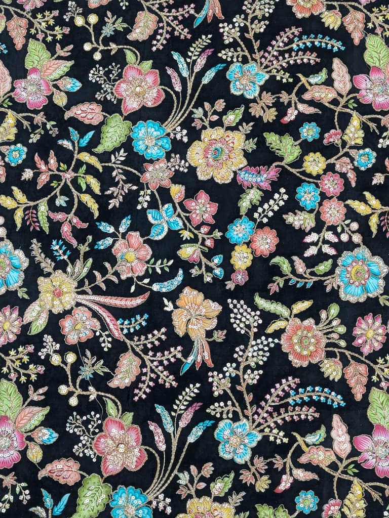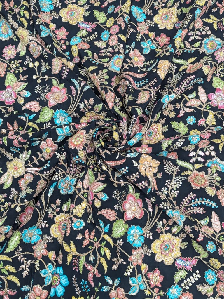 This luxurious black crepe silk fabric features an elegant floral position print that brings a rich, artistic charm to the surface. The deep black base beautifully contrasts with vibrant blossoms in soft pinks, turquoise blues, warm yellows, and fresh greens, arranged in a thoughtfully spaced composition for a refined, balanced look. Delicate zari embroidery adds a subtle metallic shimmer, enhancing the floral motifs with texture and depth.
