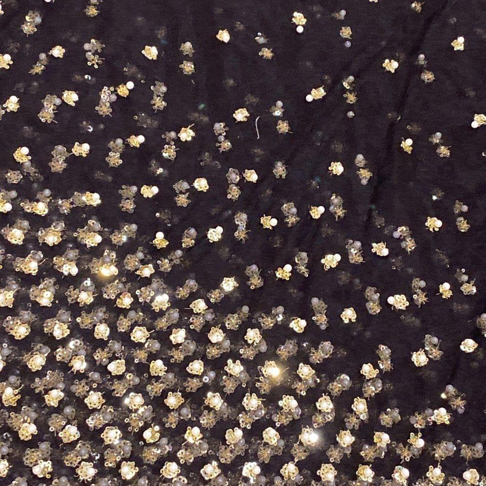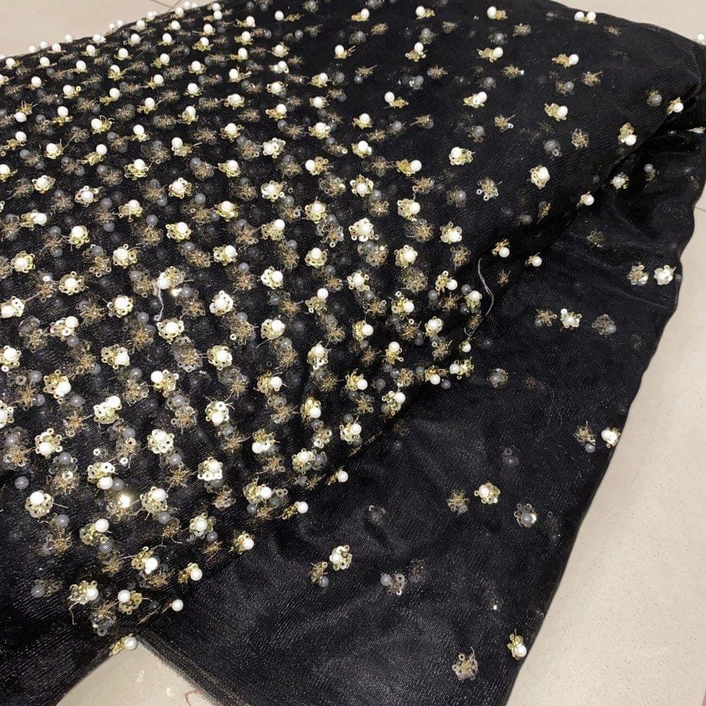 Black Colour Net Embroidery, This black net with pearls embroidery which is dense in the ghera and spreads as you go up is one of the best fabrics for lehengas and skirts.SKU: 100205261