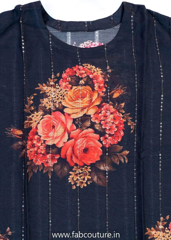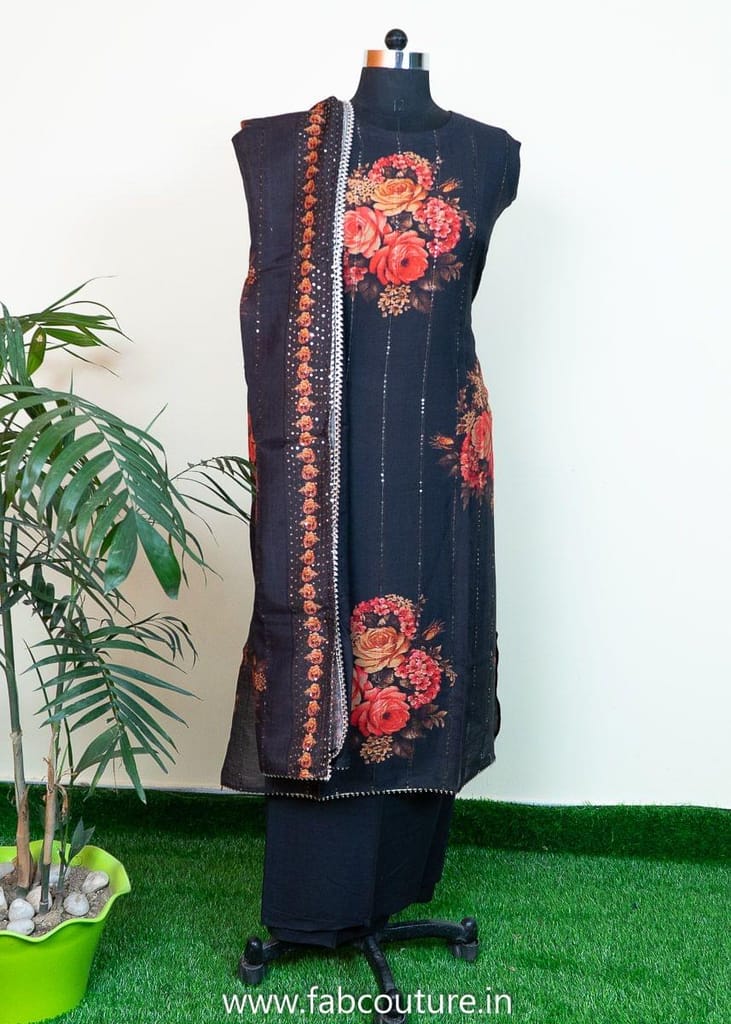 Black Muslin Embroidered Suit With Cotton Bottom And Muslin Dupatta. This is from FabCouture Unstitched Suit Set Collection and the fabric is muslin with floral print and sequins embroidery and the bottom is 2.5mtr cotton which can be stitched as per your choice into a salwar or plazzo or trouser. The dupatta is in muslin with floral print and sequins embellishment with gota details. The suit can be stitched upto size XL. SKU:100211328 DNO-4518