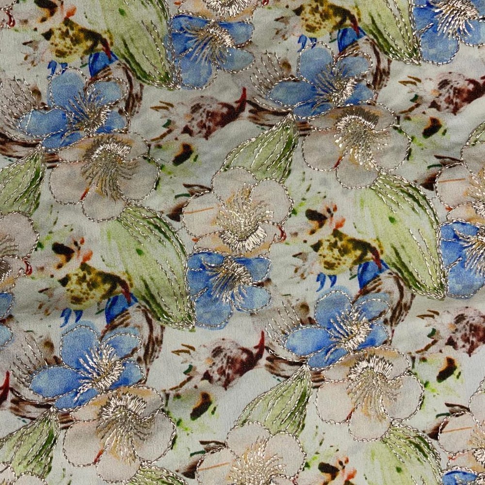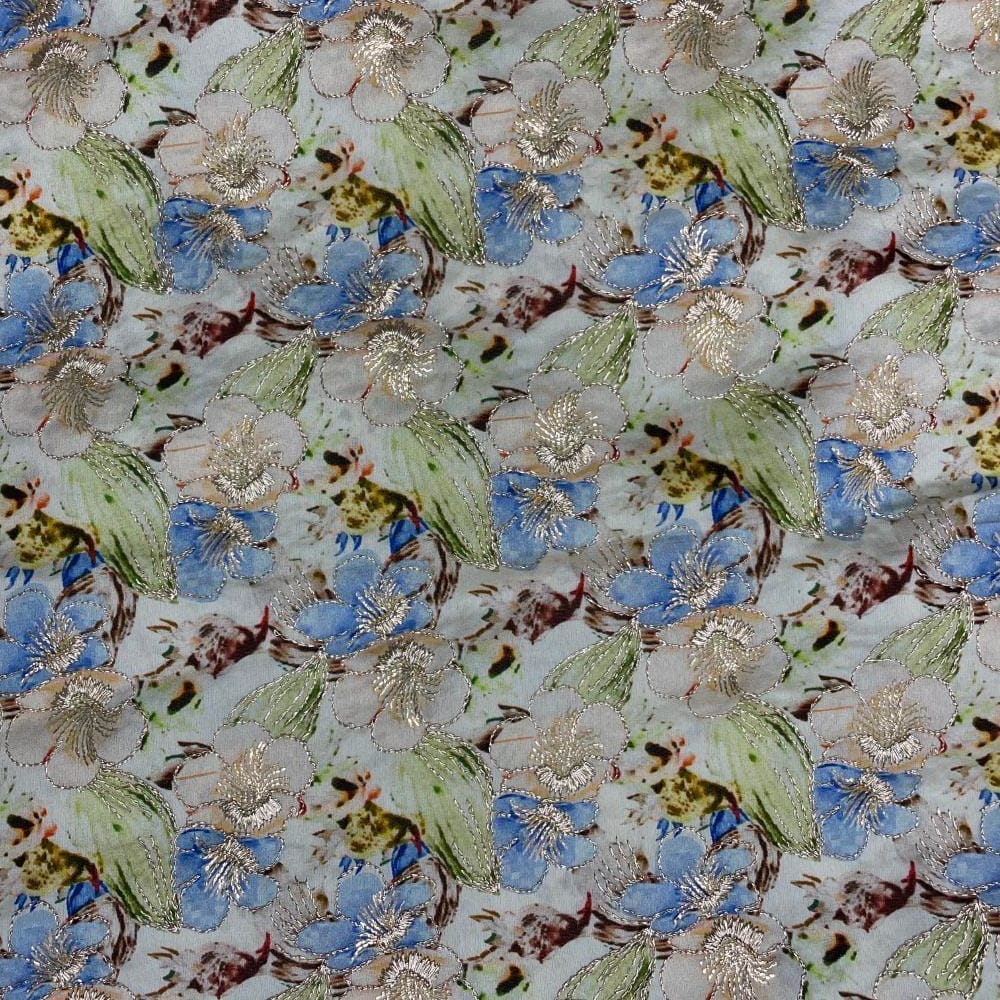 | Fabric Name | Blue Multicolor Floral Satin Tissue Embroiderd Fabric |