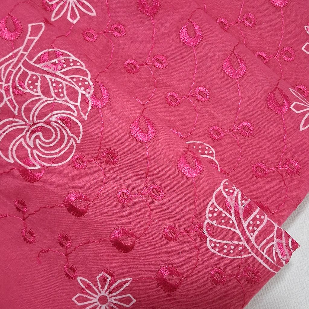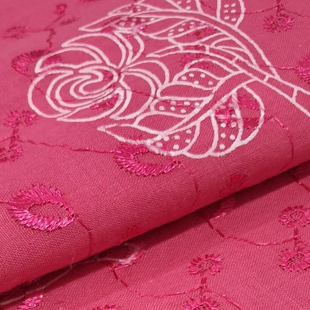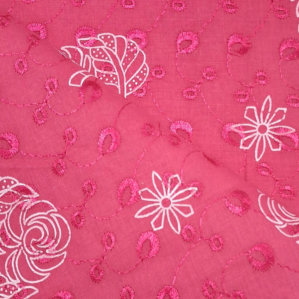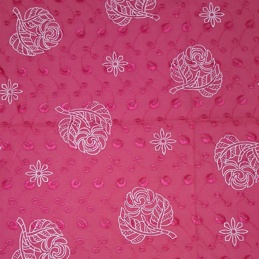 Fabric Name | Bright Pink Cotton Chikan Fabric with White Leaf & Floral Embroidery |