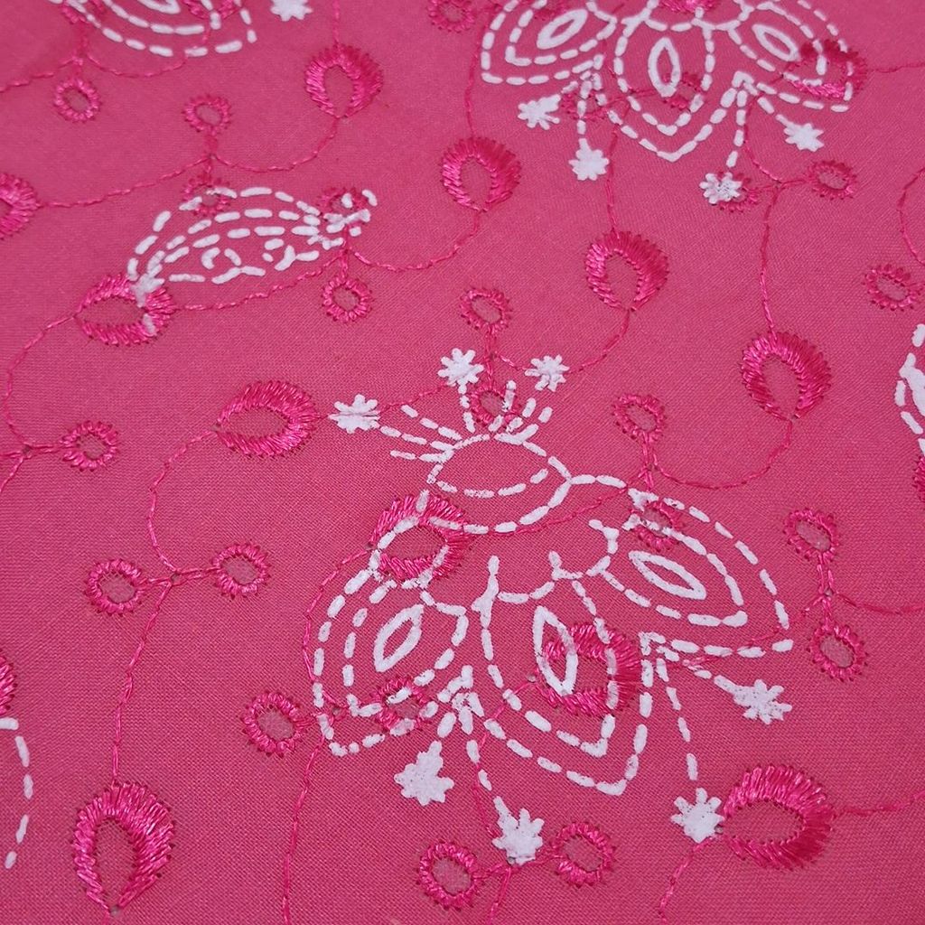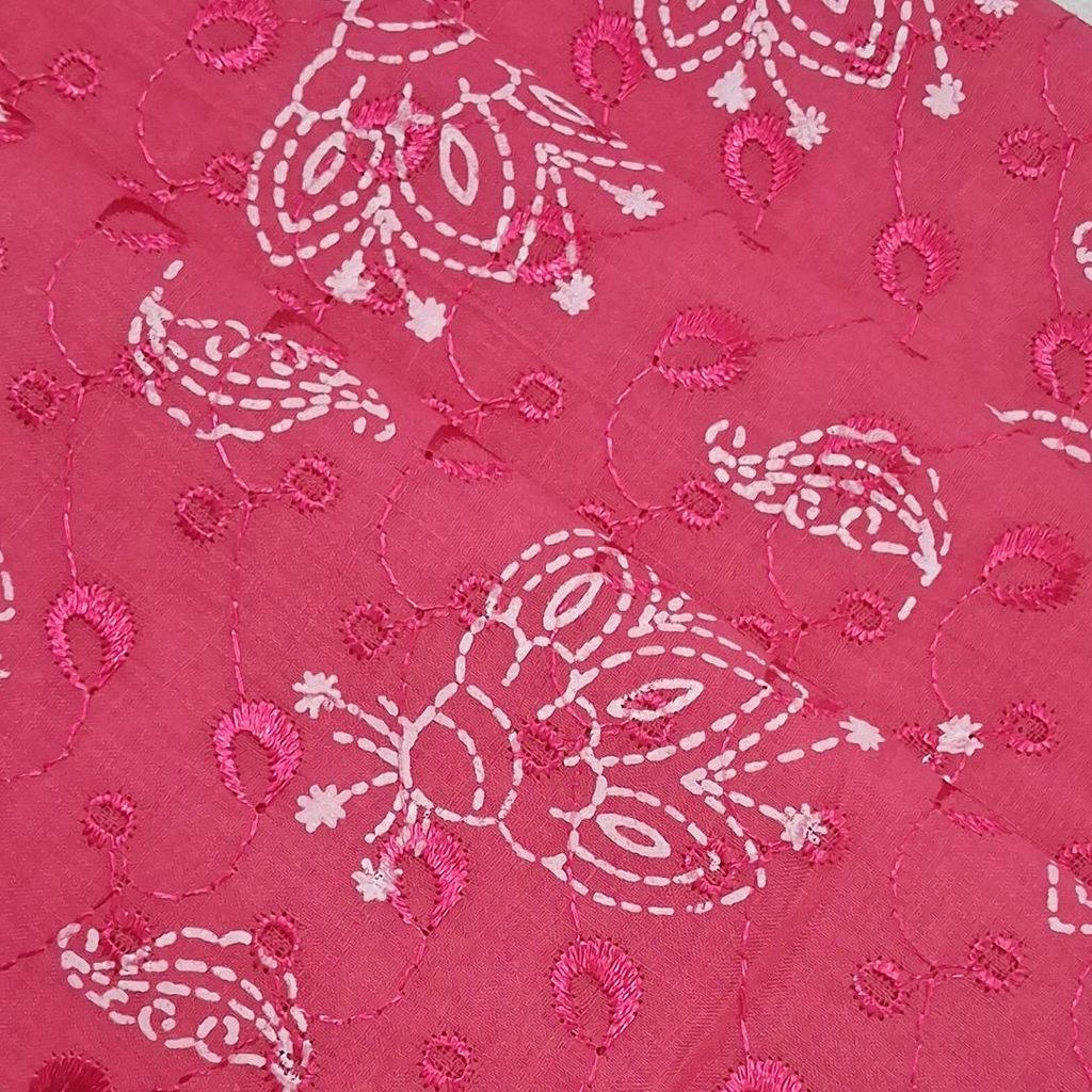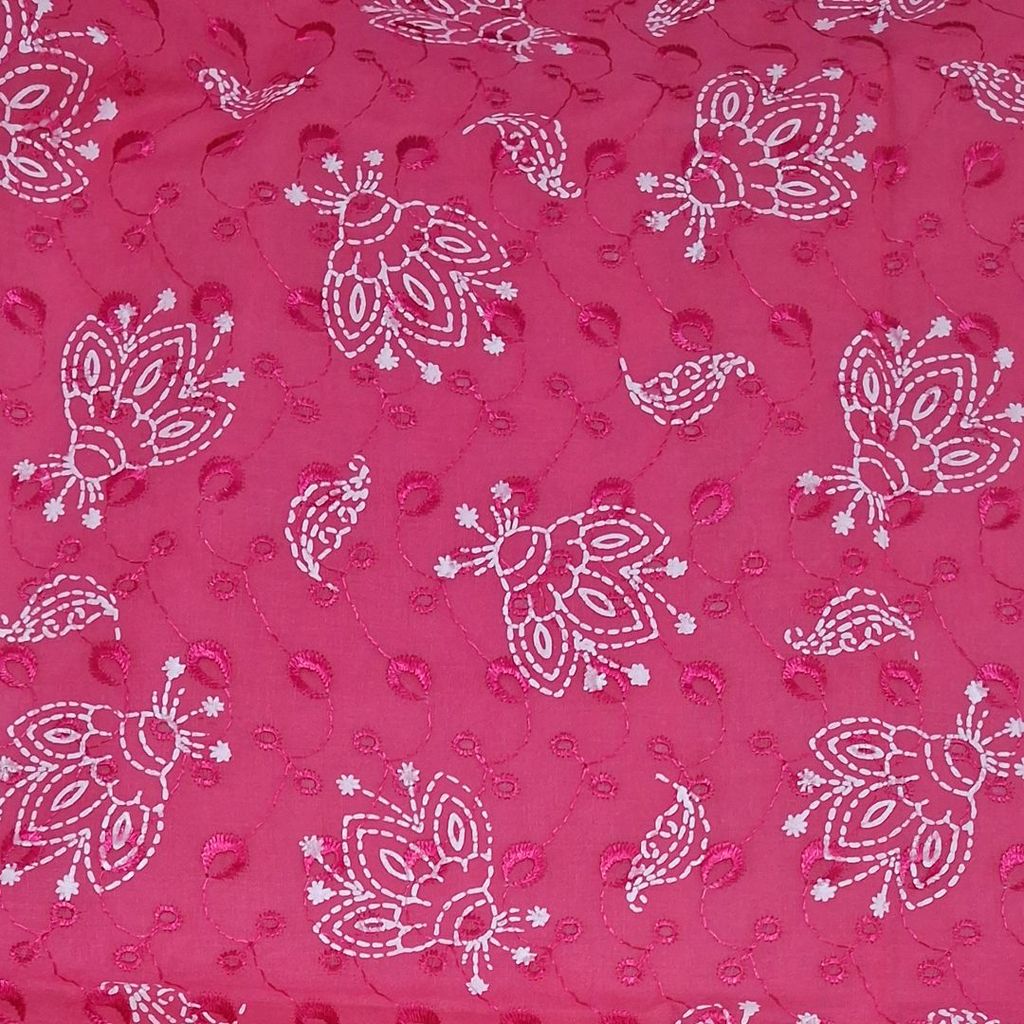 | Fabric Name | Bright Pink Cotton Chikan Fabric with White Paisley & Floral Embroidery |