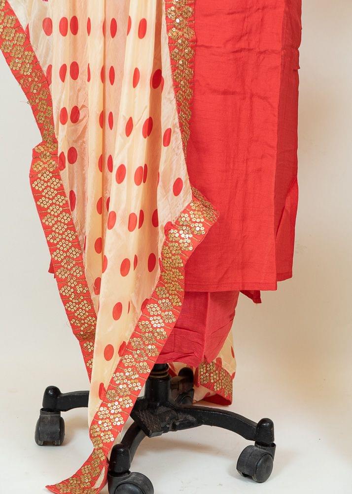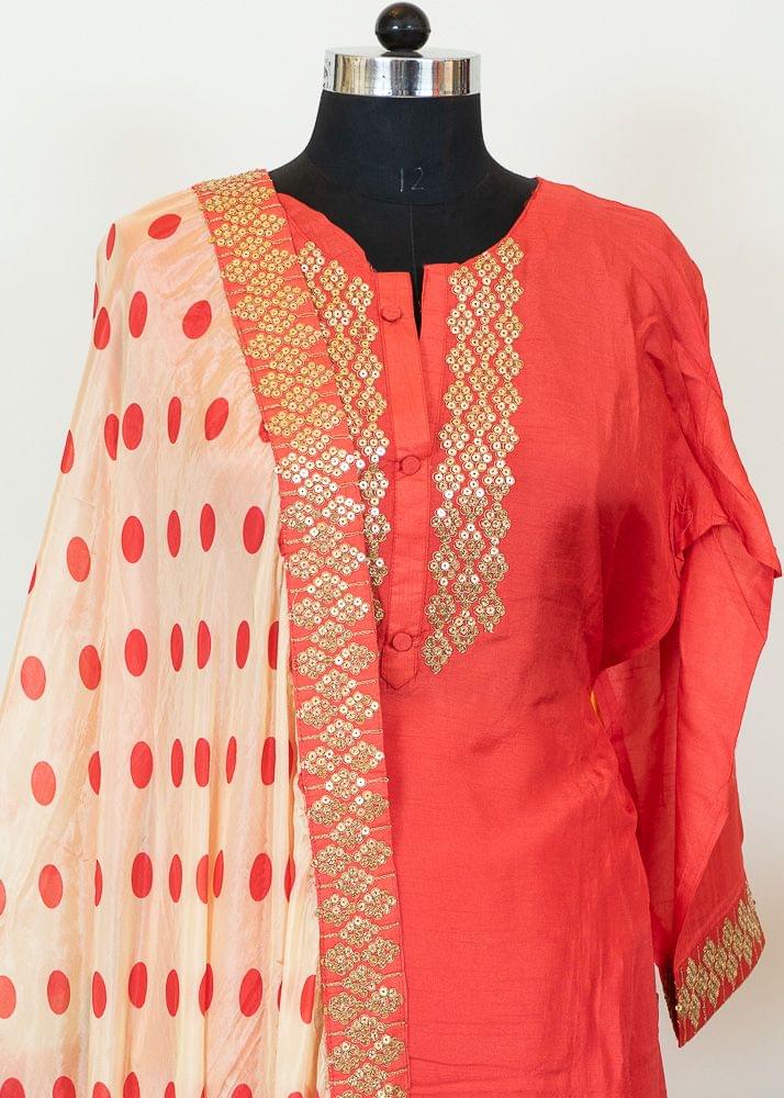 The soft and smooth Dola Silk is coming your way for that celebratory affair. The carrot coloured suit set has a beautiful sequin work in bright golden tone running on the neck and sleeves of the semi-stitched shirt. The shantoon lower is very comfortable and can be transformed into any pattern of your choice. The alluring vintage-style polka dot dupatta will take your style quotient to next level. Bring in this fusion set for the upcoming festive season. SKU: 10020654 DNO-4874