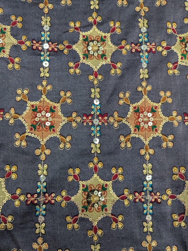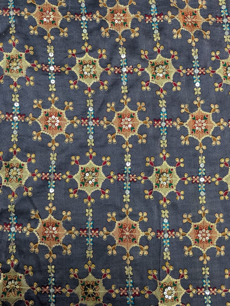 This dark charcoal gray fabric is adorned with intricate, repeating embroidered patterns and sequins.