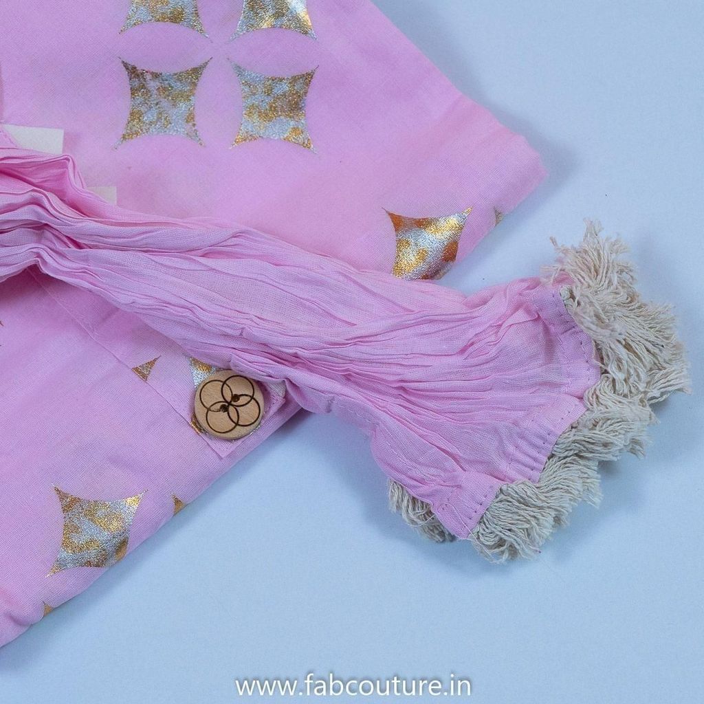 Cotton Foil Printed Suit With Embroidered Cotton Sharara And Cotton Dupatta Stitched Suit Set. This is from the FabCouture Sharara Sets Collection and the fabric is pure cotton in a pretty pink with foil print and the sharara is pure cotton with embroidery and dupatta is crushed mul cotton with tassel details. It is stitiched to fit size L. SKU: 100211039