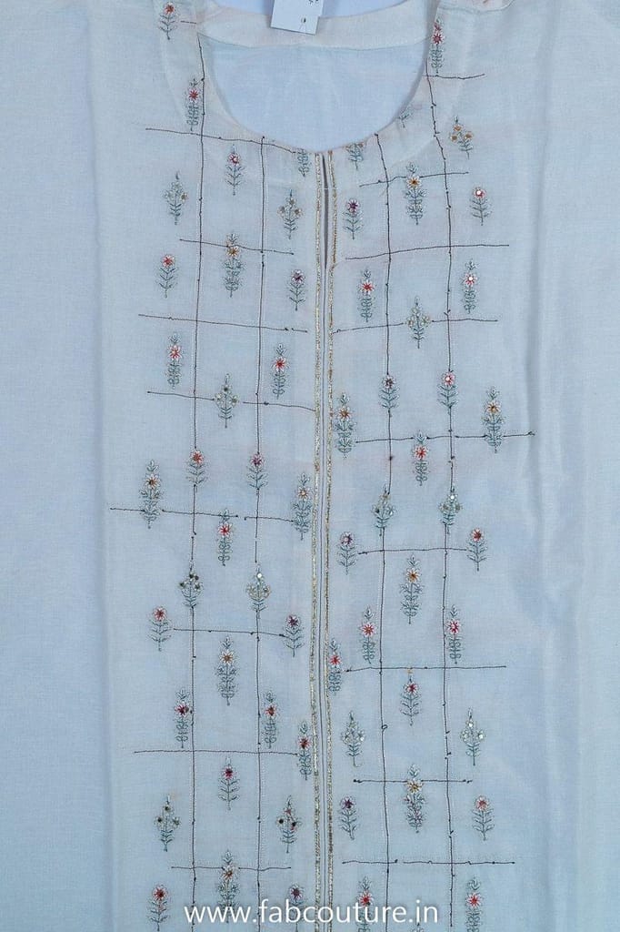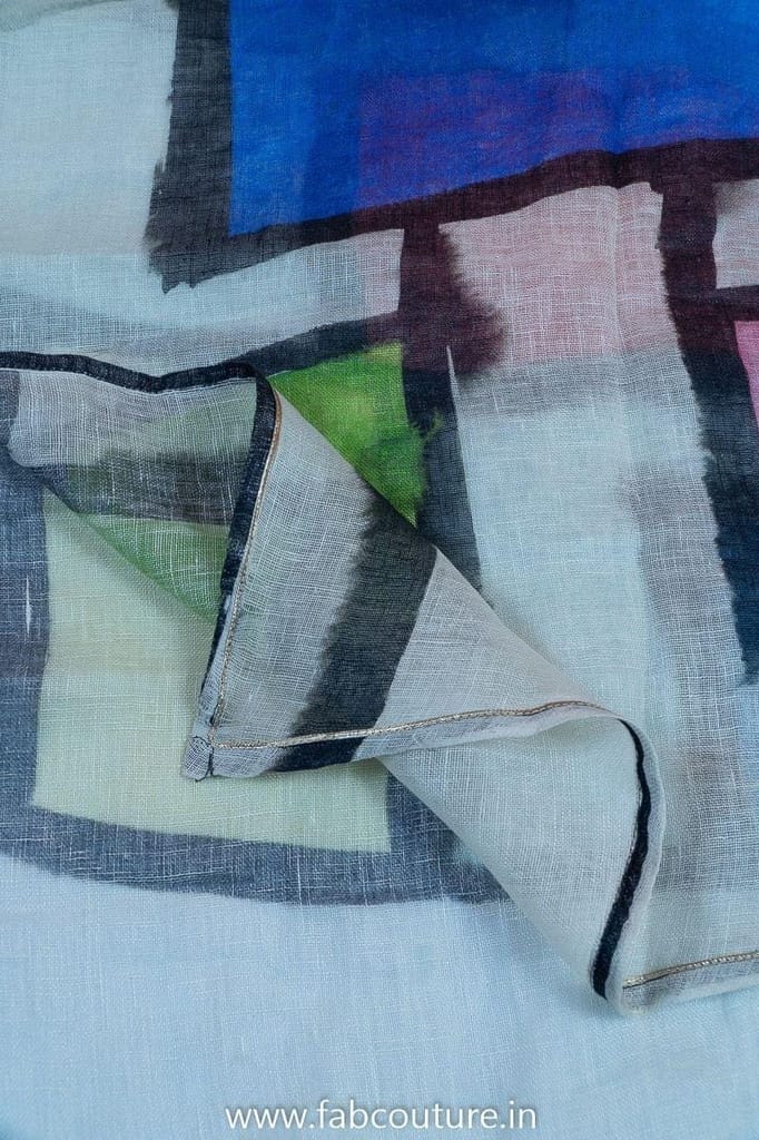 This is from FabCouture Suit Sets Collection and the fabric is cotton linen with pretty thread embroidery on the front and the bottom is 2.5mtr cotton with abstract print cotton linen dupatta with finished edges. It can be stitched to size XL. SKU: 100211340 DNO-3879