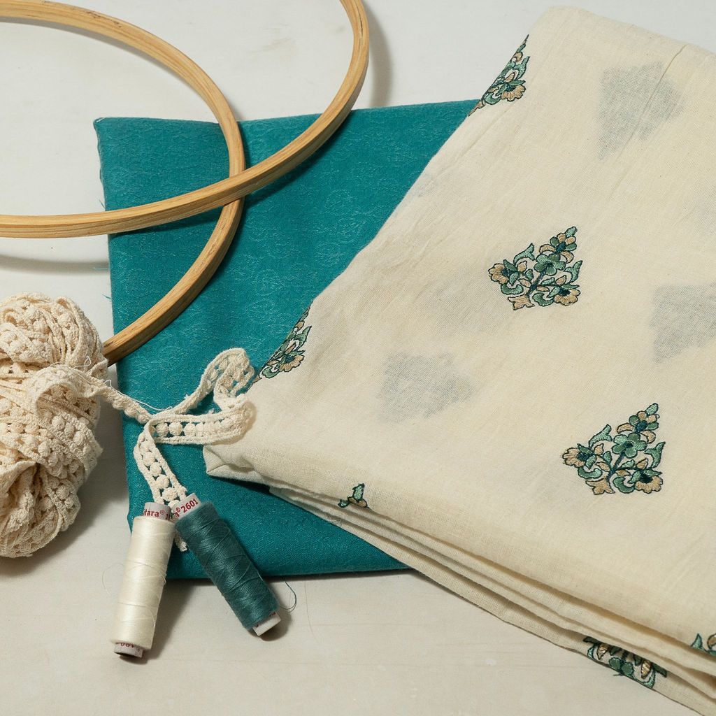 | Fabric Name | Cream Color Cotton Embroidered Fabric with Lace and Green Color Cotton Jacquard Fabric DIY Set |