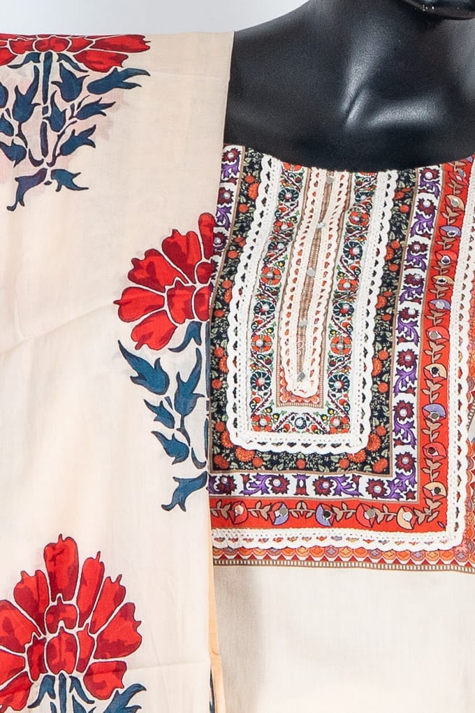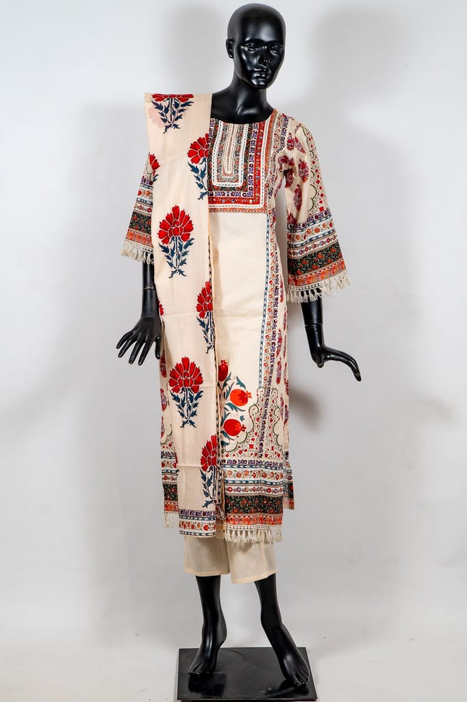 | Fabric Name | Cream Color Cotton Print with Embroidered Shirt with Cotton Pant and Cotton Printed Dupatta |