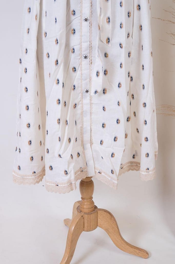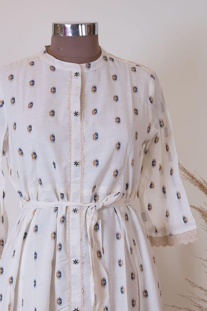 This ikkat cotton dress in offwhite has a relaxed silhoutte and comes with a belt to accentuate the curves well. It has a smart fit and should definitely be in your summer wardrobe. It also has lace detailing.