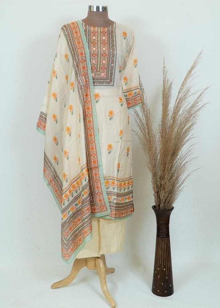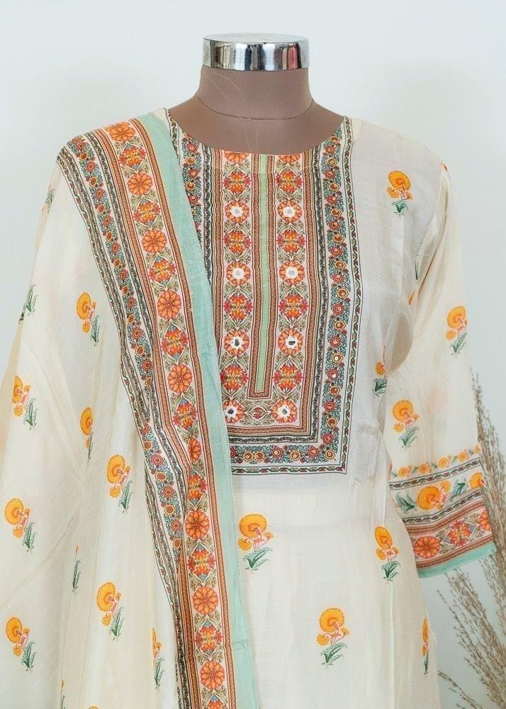 Stand out in the crowd with this elegant suit set. The vibrant colours form the perfect union for you to dazzle like a diva. The voil printed off-white set adds a flair to your summer wardrobe. The ornated neckline with a pinch of mirror work makes it perfect for any occasion. The decorated kurta along with the dupatta showcases a vintage vibe. Team it up with Kundan earrings and juttis and you are party-ready. SKU:100221670 DNO-KT387