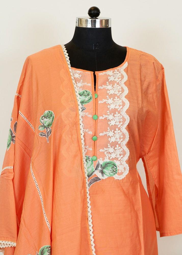Soaked in bright and electrifying shades for this festive season, Fab Couture's latest edit is all about celebrations. The semi-stitched chanderi shirt has a charming lacework along with a white schiffli hemline. The minimal rose motif runs on shirt and dupatta. The decorated voile dupatta has a feathery touch and crochet lace on the borders and across the length breaks the monotone look. Add a pop of pretty colours in your wardrobe for the upcoming festivities. SKU: 100211109 DNO-3011