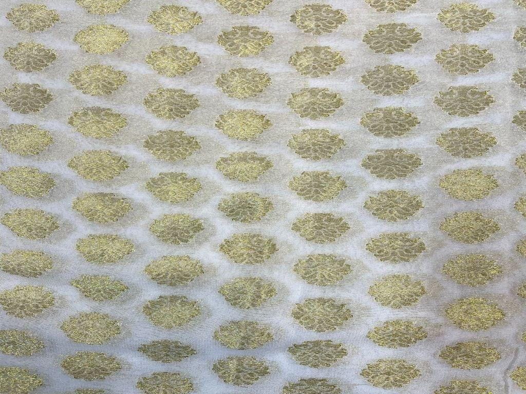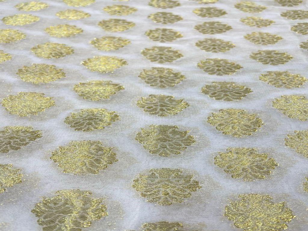 | Fabric Name | Dyeable Banarasi Semi Georgette White Golden Flowers 1 |