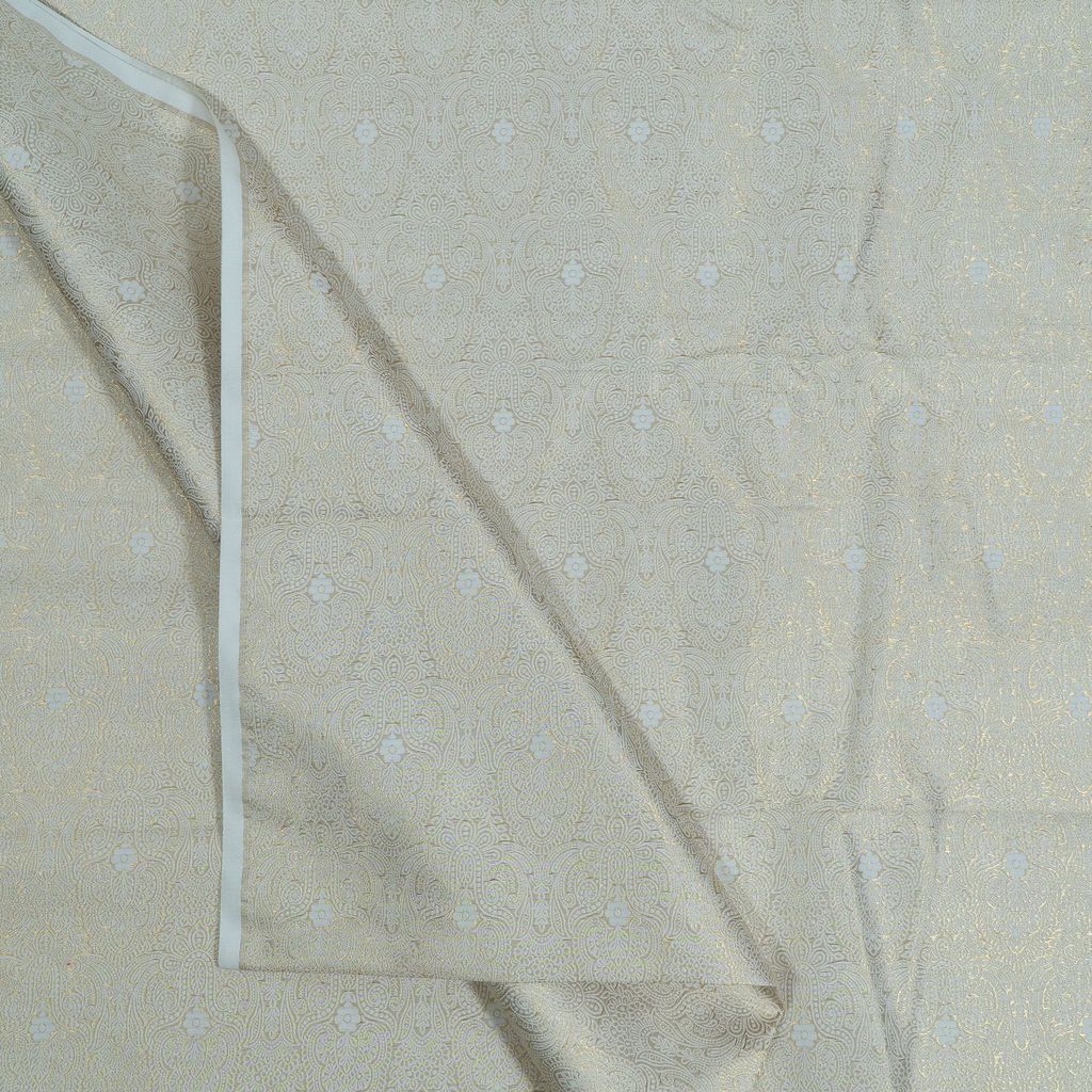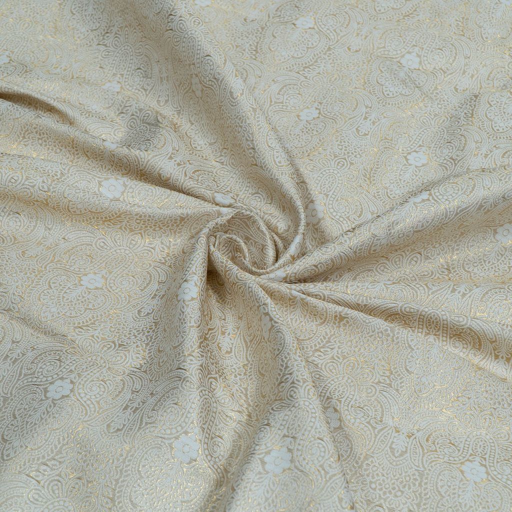 Unleash your creative vision with our luxurious Premium Dyeable Brocade Fabric. This collection features a substantial, high-quality base (160 GSM) woven with intricate jacquard designs. The shimmering gold/metallic motifs are beautifully contrasted against the neutral, off-white base, which is designed to be fully dyeable.