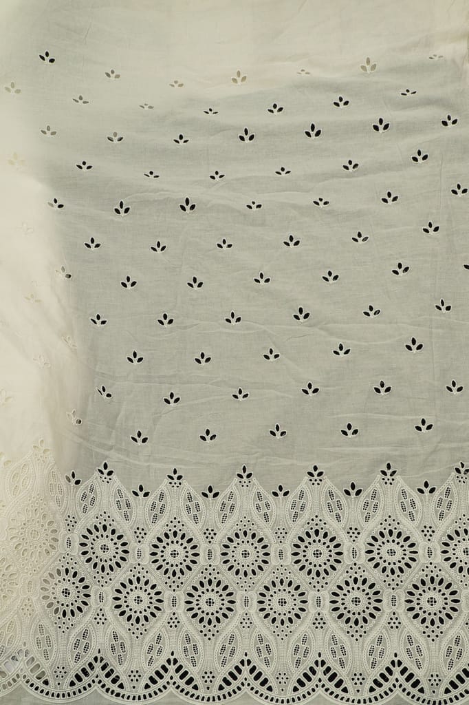 This Cotton Schiffli Fabric is where timeless craftsmanship meets breathable comfort. Crafted on a soft cotton base, the fabric features delicate schiffli embroidery with intricate cutwork patterns, highlighted beautifully along the border with ornate scalloped detailing.