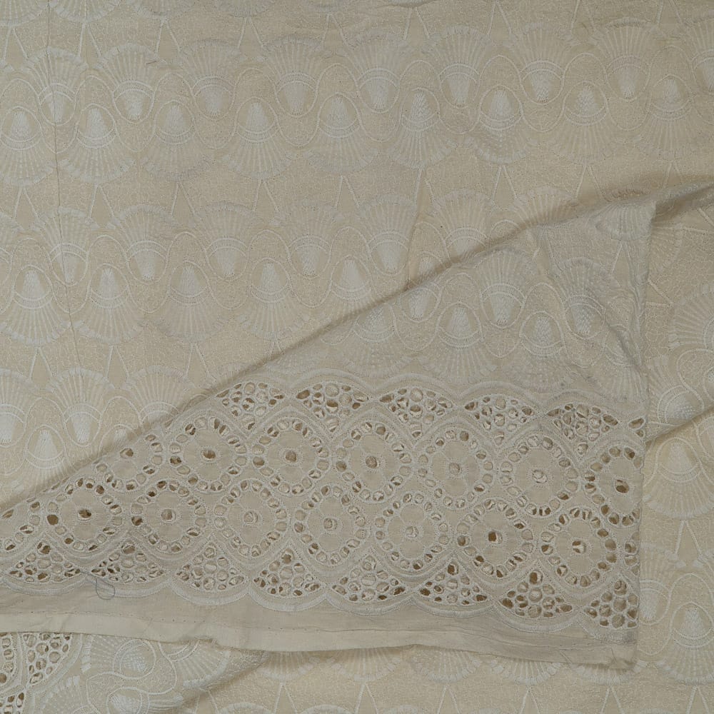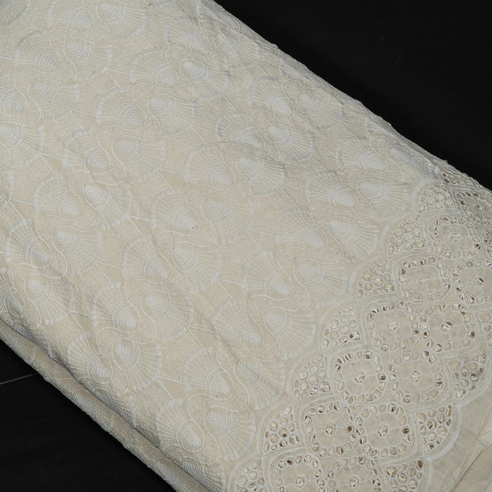 This White Cotton Schiffli Embroidery Fabric is the perfect blend of comfort and understated beauty—ideal for timeless wardrobe staples with a handcrafted touch