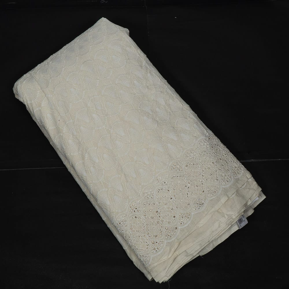 Classic, elegant, and timeless—this White Cotton Schiffli Embroidery Fabric is a beautiful choice for both modern and traditional wear. Crafted on soft, breathable cotton, this fabric features delicate white-on-white thread embroidery, enhanced with signature Schiffli eyelet holes that create a refined, airy texture. A detailed border with eyelet cutwork runs along one side of the fabric, making it perfect for hemlines, dupattas, or statement sleeves.