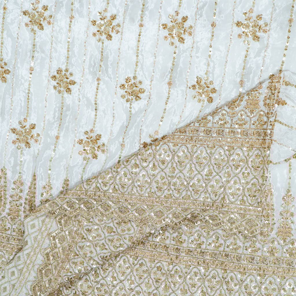 Experience the ultimate blend of classic texture and modern sparkle with FabCouture’s Dyeable Crepe Beads Embroidered Fabric. The fabric features a luxurious, subtle crimped surface inherent to Crepe, giving it an exceptional, graceful drape. It is richly embellished with meticulous beadwork, adding a substantial, glamorous dimension and weight to the textile. At 250 GSM, it offers a wonderful structure while maintaining its flow. The dyeable feature ensures complete customization, allowing you to achieve the perfect shade for high-impact bridal and occasion wear.