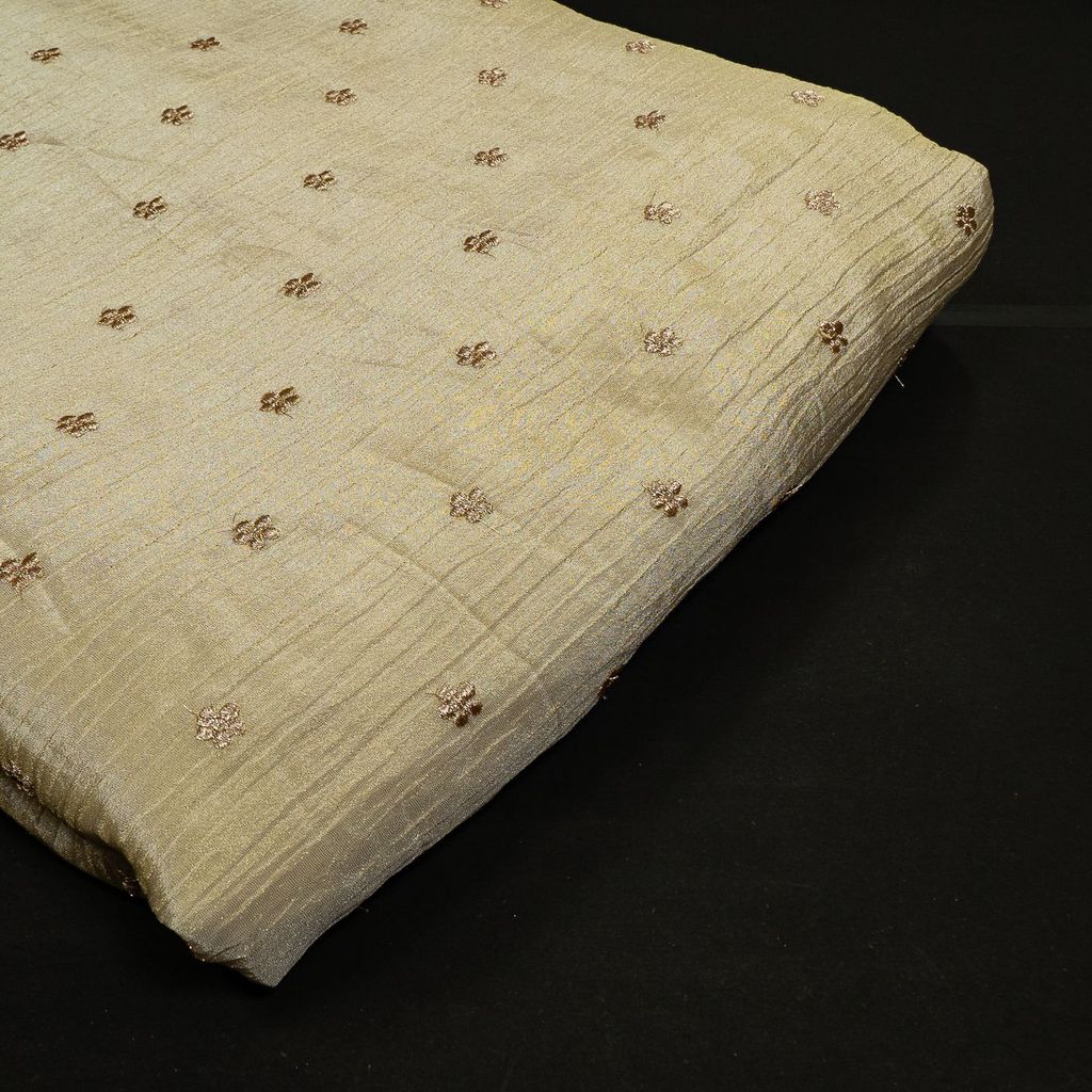 This delicate yet durable tissue Crush fabric features detailed embroidery and is perfect for creating high-end ethnic wear. The fabric's lightweight nature ensures comfort, while the embroidery adds a sophisticated touch. Dyeable in any colour, it is perfect for sarees, lehengas, and custom-designed bridal outfits. SKU: 100245280