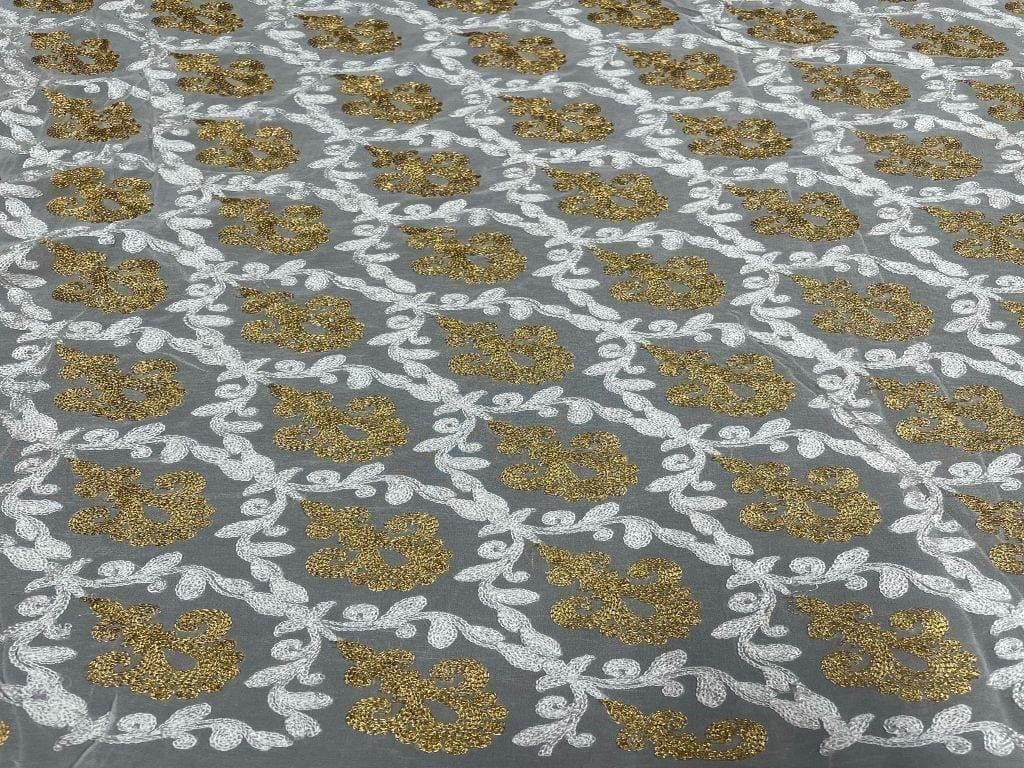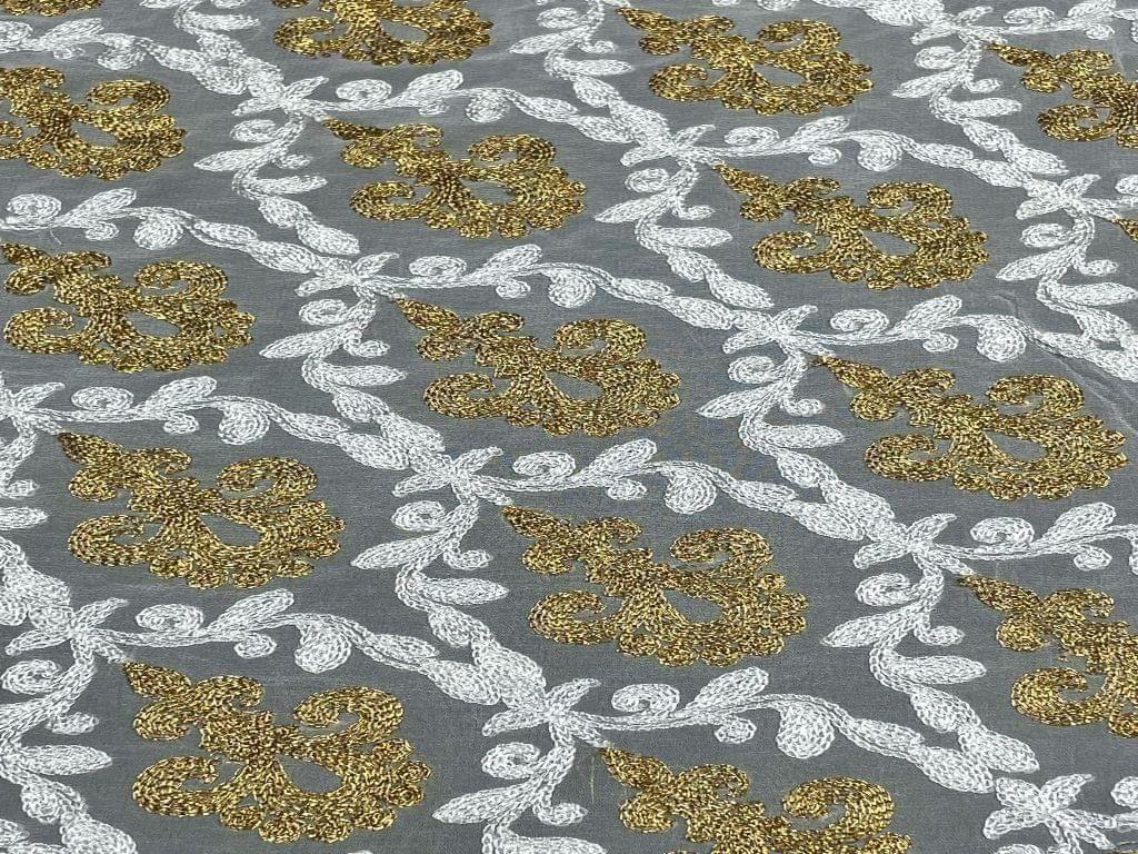 Dyeable Embroidered Georgette White Golden Floral Motifs 2 Width 44 Inch / 112 Cm SKU:K1514