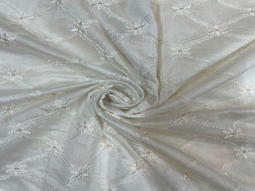 Dyeable Embroidered Pure Chanderi Silk White Floral With Border Width 56 Inch / 142 Cm SKU:K1642