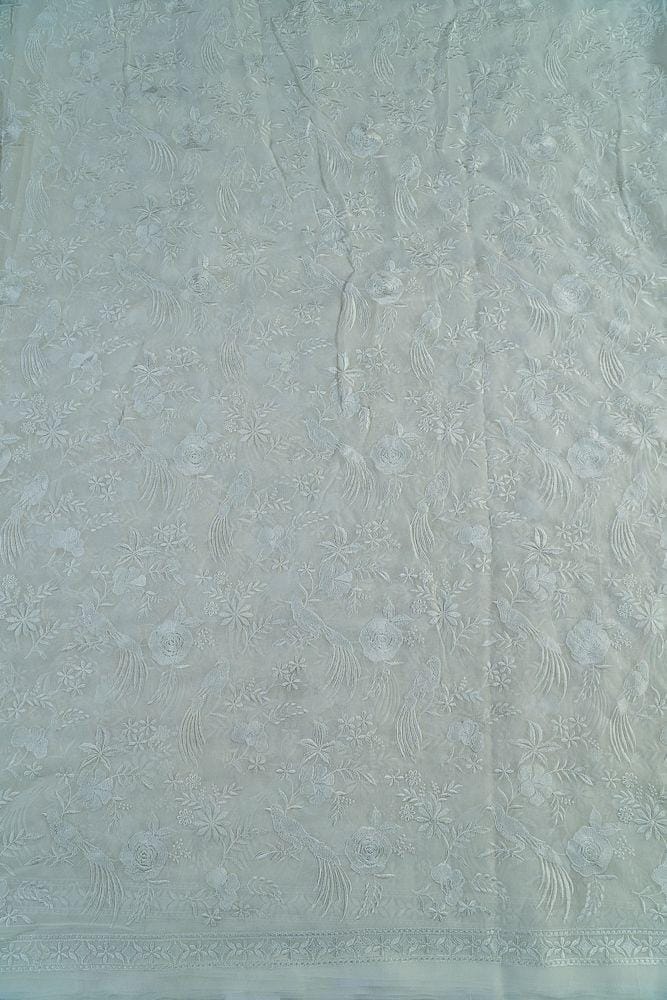 This white dyeable fabric in georgette has all white thread embroidery which are close-knit and has a very heavy look. It is an excellent fabric for lehengas and cholis as well as sarees and blouses. It has a good fall and flow and it is good for any wedding attire as well. SKU:10023178 D.No 54123