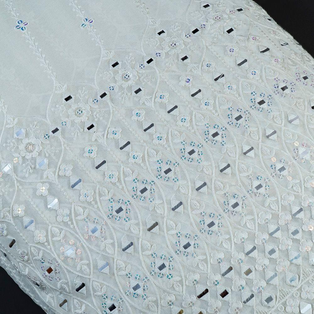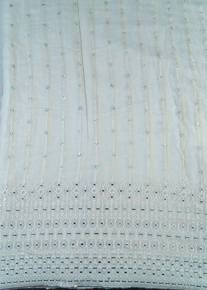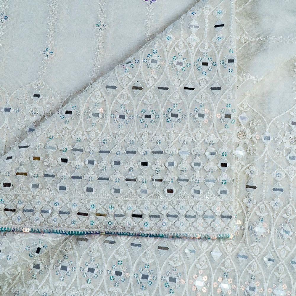 When you want to create that charismatic yet sober look, go for this georgette fabric with thread embroidery dipped in sleek mirror work. The dyeable fabric comes with a very sophisticated pattern on the border along with a very chic pattern running through the length. The cool and comfortable material is what you need for those special moments. Bring out that designer n get a funky tone of your choice. Apt for any Kurta, long shirt, skirt, Lehenga or even gown as the fabric comes with big width. Dazzle the party with this classy ensemble from Fabcouture. SKU:100224435 GEO EMB D.NO 89096