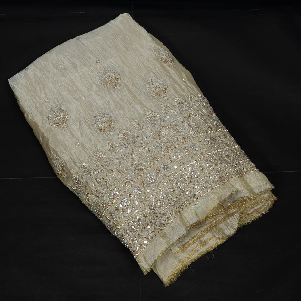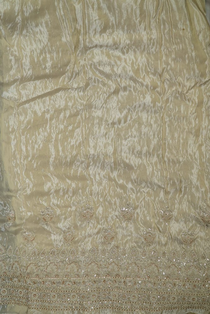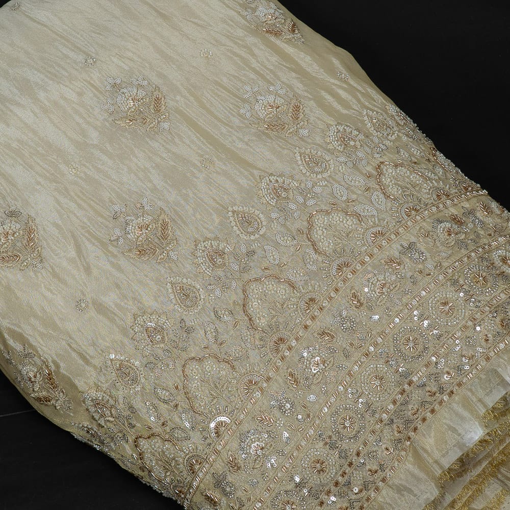 This exquisite Tissue Embroidered Fabric is crafted on a premium viscose base, offering a soft touch and fluid drape with a luxurious shimmer. Adorned with delicate beads and sequins in a subtle water golden hue, the fabric features an intricately embroidered border on one side and scattered embroidered booties across the rest—creating a perfect blend of richness and elegance. What makes this fabric truly versatile is its dyeable nature, allowing you to custom color it to match any design vision while retaining the golden embellishments.