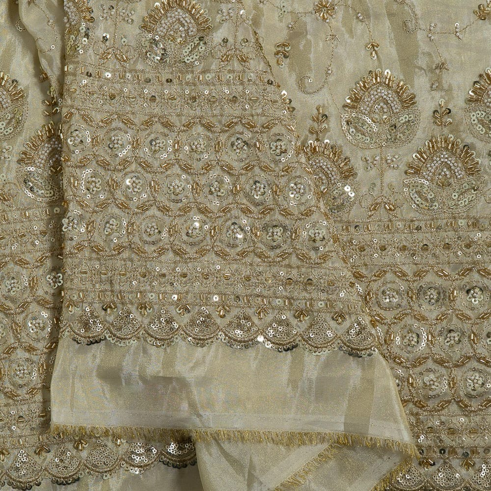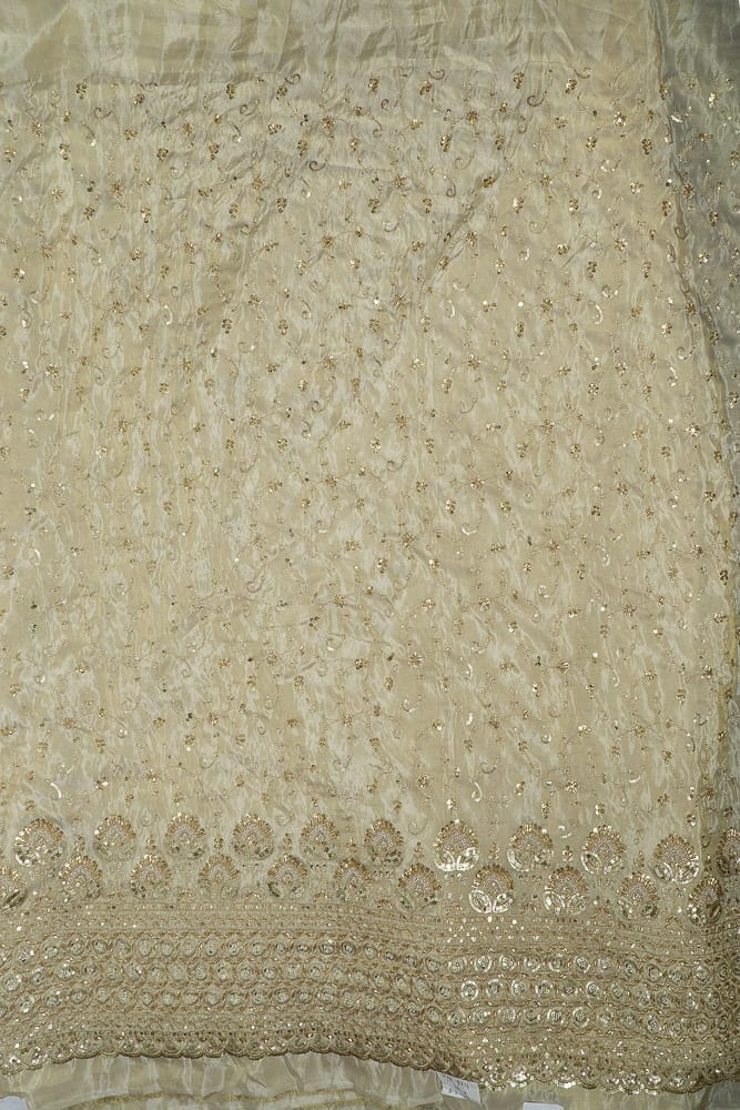 This exquisite Tissue Embroidered Fabric is crafted on a premium viscose base, offering a soft touch and fluid drape with a luxurious shimmer. Adorned with delicate beads and sequins in a subtle water golden hue, the fabric features an intricately embroidered border on one side and scattered embroidered booties across the rest—creating a perfect blend of richness and elegance. What makes this fabric truly versatile is its dyeable nature, allowing you to custom color it to match any design vision while retaining the golden embellishments.