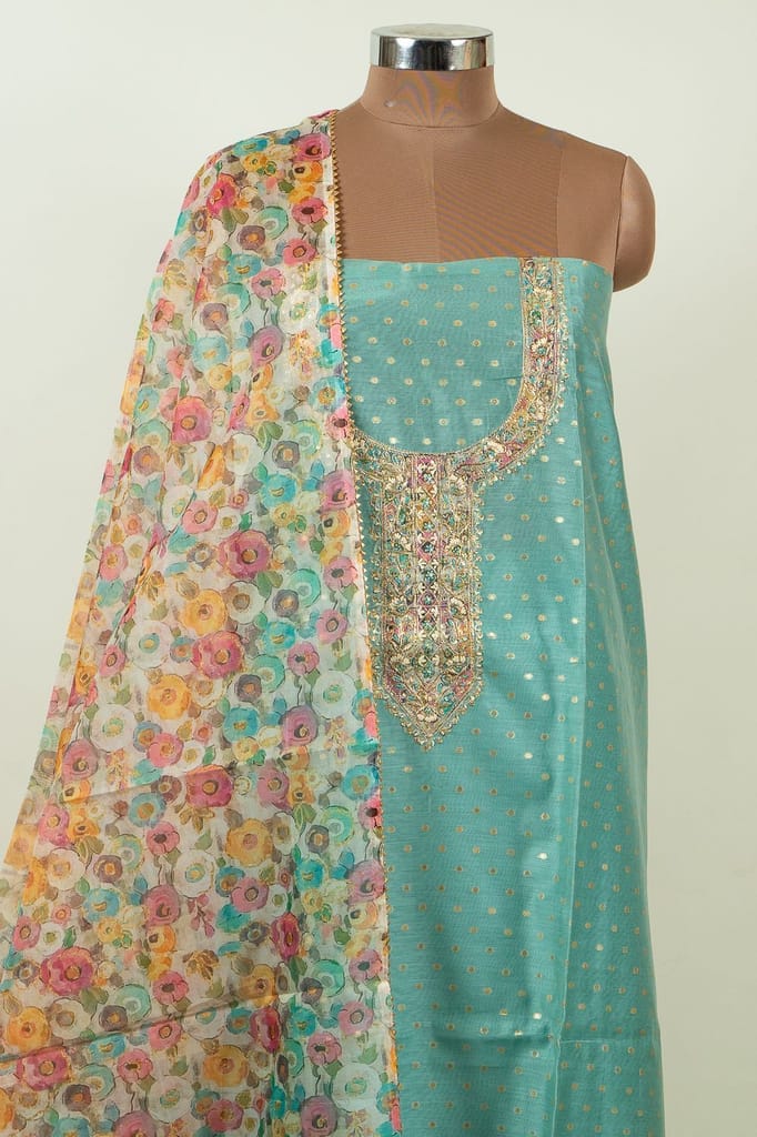 | Fabric Name | Firozi Color Chanderi Embroidered Shirt with Bottom and Organza Printed Dupatta |