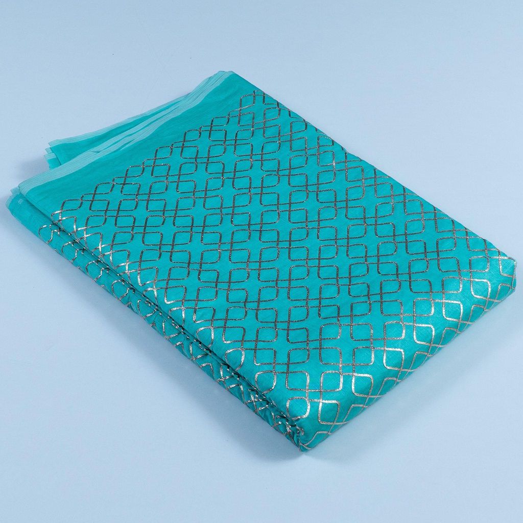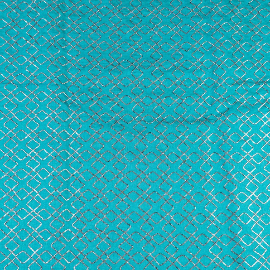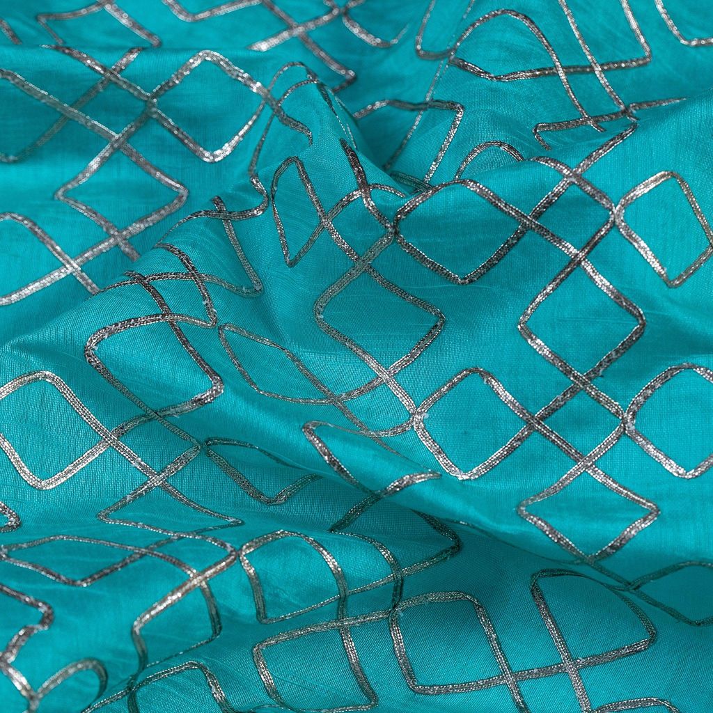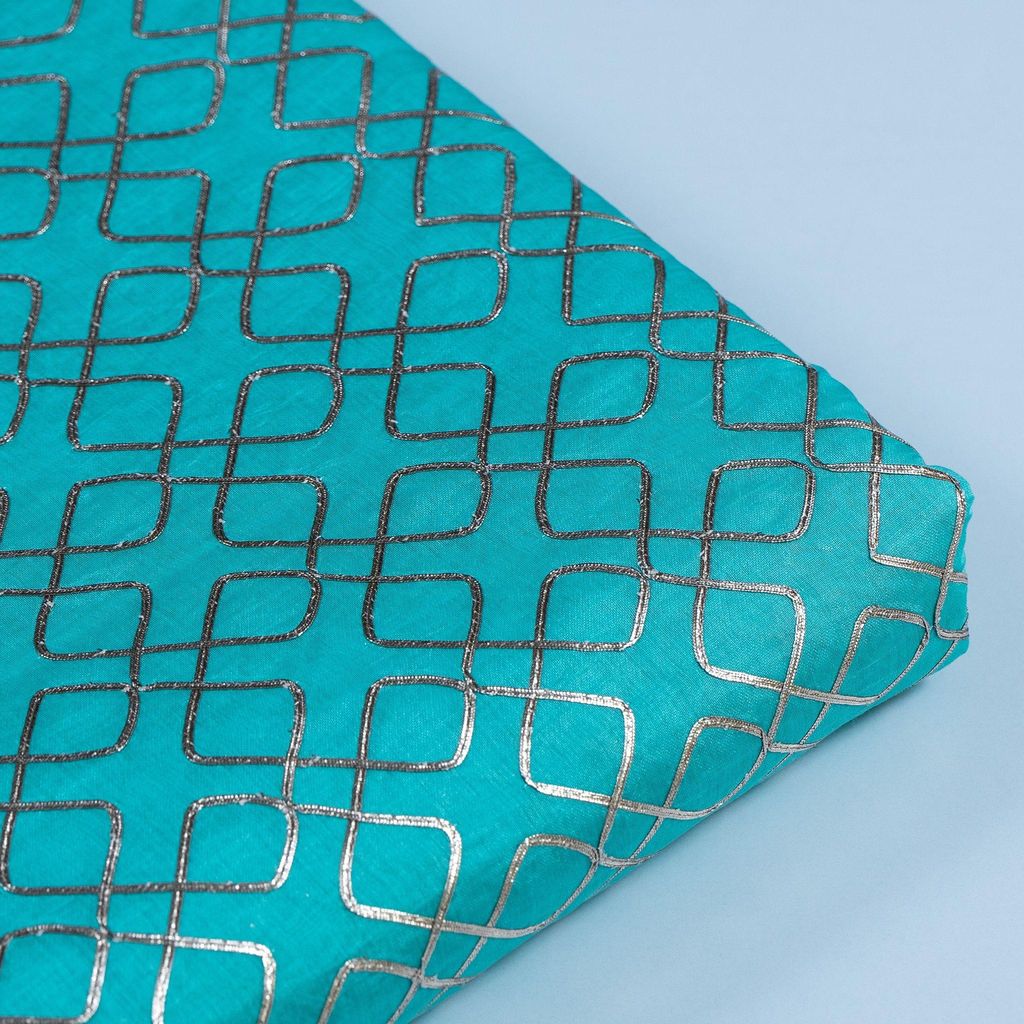 Firozi Chanderi Embroidery Fabric With Golden Gota honey comb Patern, Can Used for making lehengas-choli, shirts, salwar-kameez, Tops, this fabric is fabulous for all. SKU:1002266