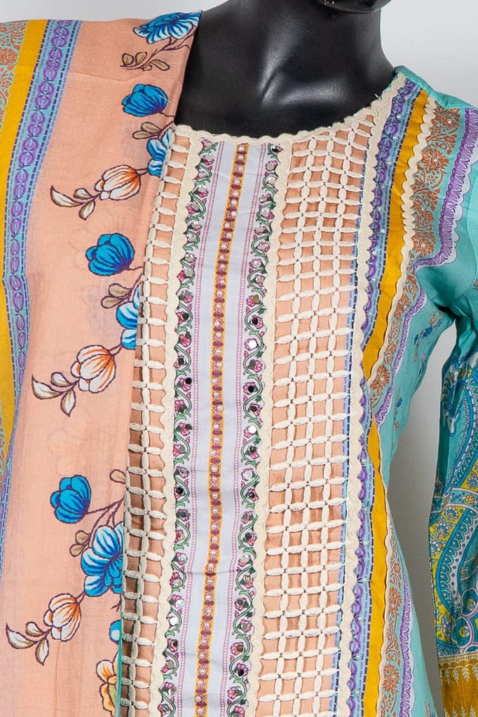 | Fabric Name | Firozi Color Cotton Print with Embroidered Shirt with Cotton Pant and Cotton Printed Dupatta |