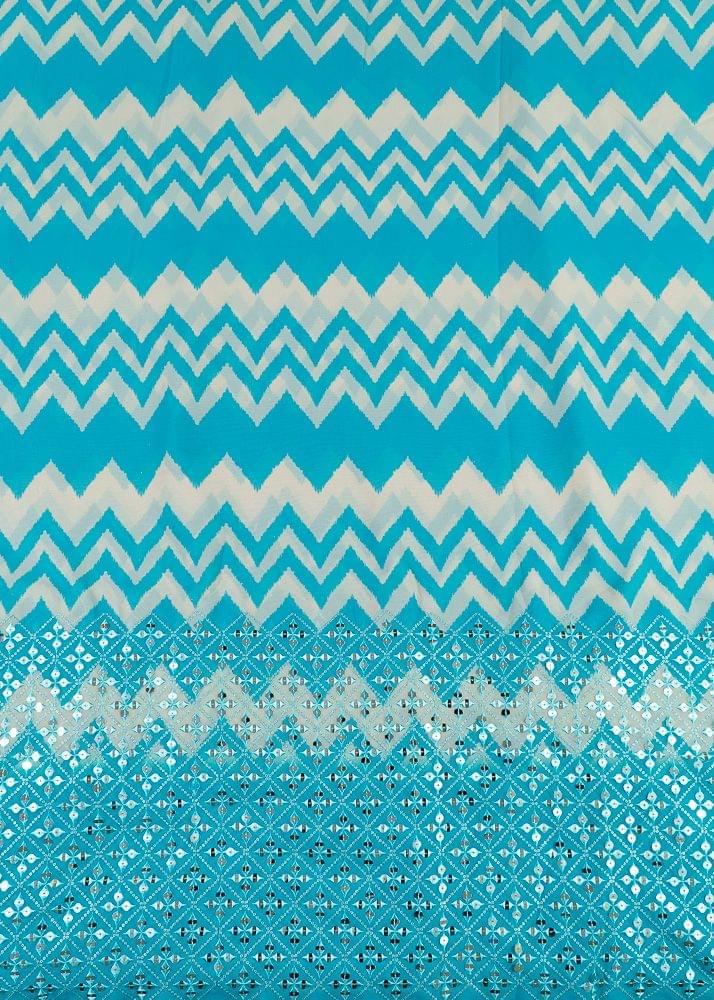 This comes from FabCouture Digital Print with Embroidery Collection and the base is georgette which is soft, flowy, smooth, rich, has a sheen and very delicate to touch. The print is a digital Geometric zig zag print which has been further enhanced by thread with sequins embroidery which makes it a beautiful fabric for sarees, dupattas, lehengas, cholis, capes and all designer outfits. SKU:10022292