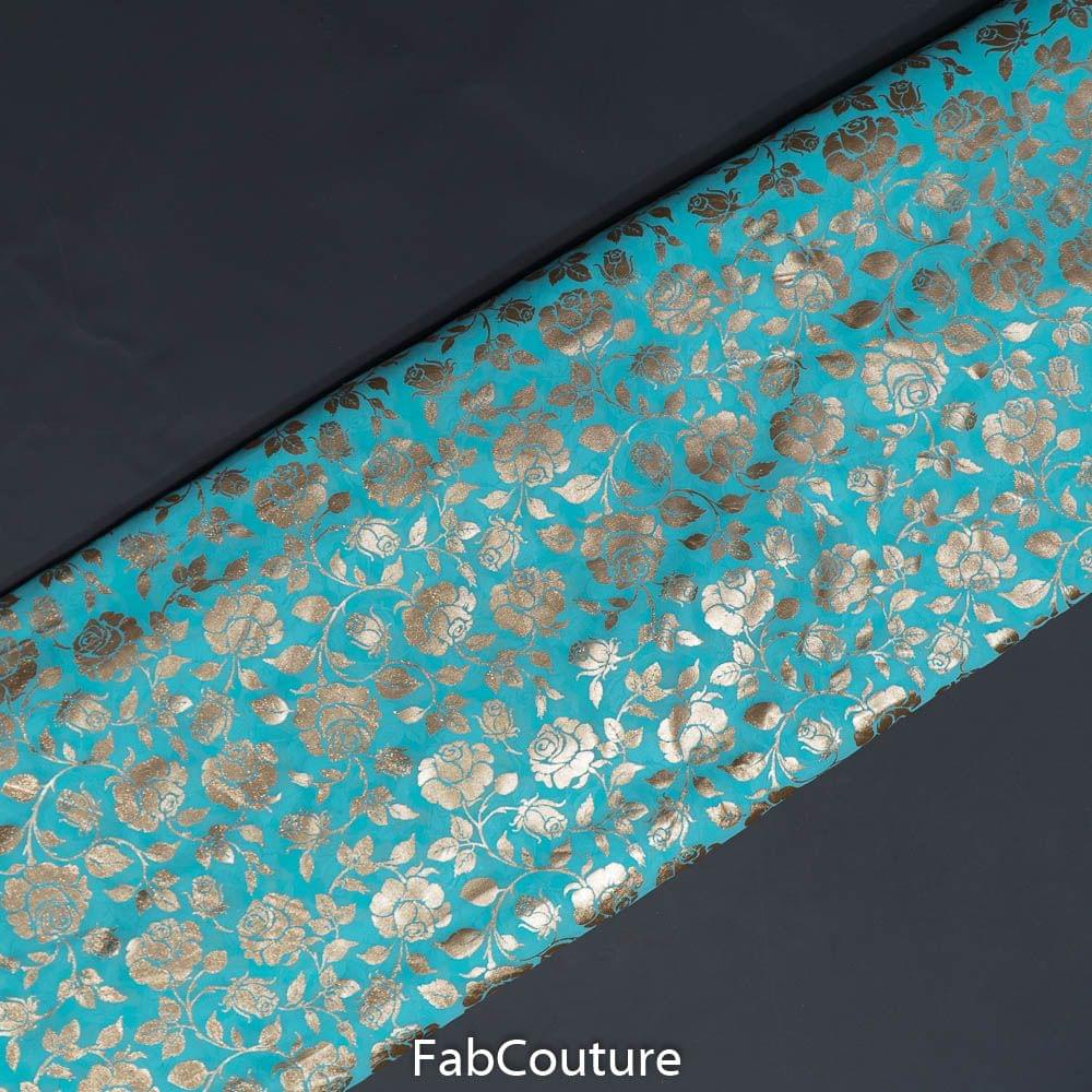 Firozi Colour Georgette Foil Floral Print , This georgette fabric is sheer, flowy and has an excellent fall which makes it best for sarees, dresses, draped silhouttes, plazzo pants, blouses and tops. The foil print is the cheery on top which makes it dressier. SKU: 10021597