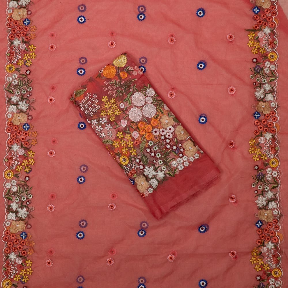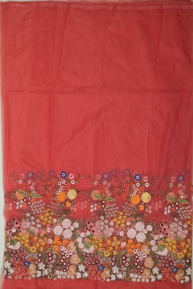Celebrate your special moments in this more than perfect organza set from the house of Fab Couture. The beautifully curated floral embroidered border is a symbol of elegance and charm. Soaked in accentuating Gajree colour, the rich and royal texture of the lustrous fabric is apt for all seasons. The matching dupatta is adorned with majestic floral work on borders and delicate motifs across the length of the material. You can pair it with shantoon or crepe bottoms. Supporting it with the astar (lining), design your own kurta, Anarkali, top and even a casual shirt. SKU:100234272-77. D.No. AO8319