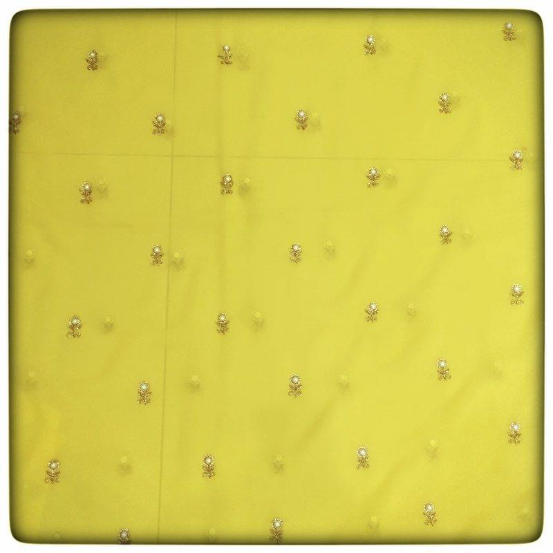 Width-44inch Beautiful Hand Work Embroidery On Yellow Poly Gergette With Moti And Stones, SKU: Ylw Geo Hnd Wrk