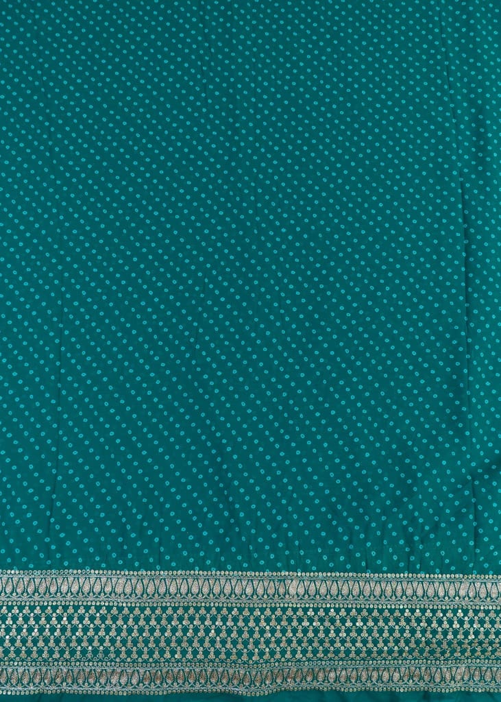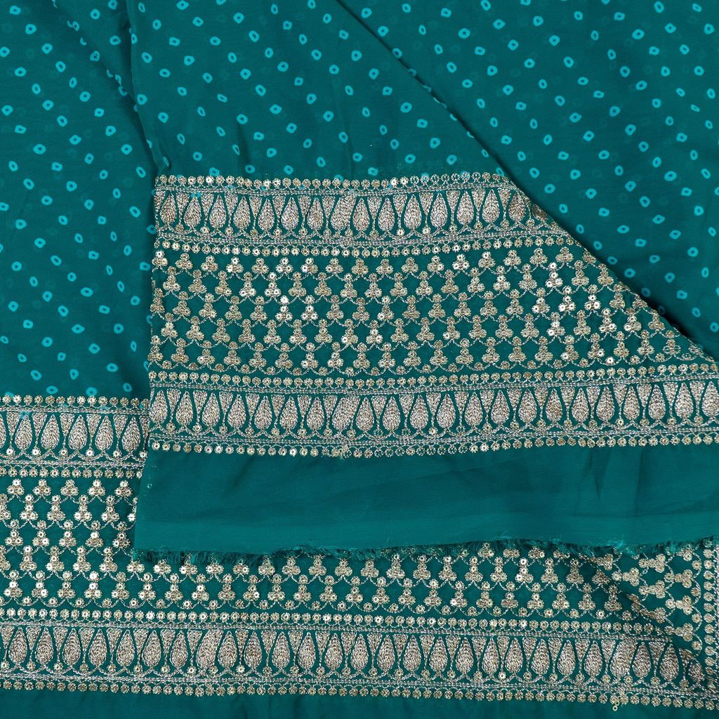 Festivities mean a bit of sparkle and shine. Look as pretty as you are in this gorgeous bandhani outfit. The carefully done embroidery in golden tinted tone makes a lavish border running across the length. The georgette fabric serves the purpose well for any occasion wear ensemble, whether it's an indo-western skirt or shirt, lehenga or a traditional saree. The smooth texture, lightweight, and evergreen colours call for a bit of space in your collection. SKU:100223366