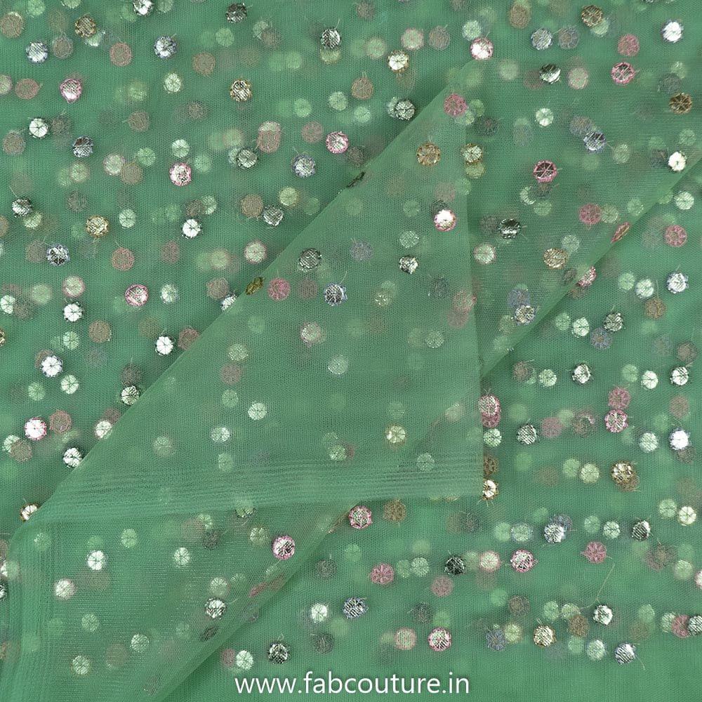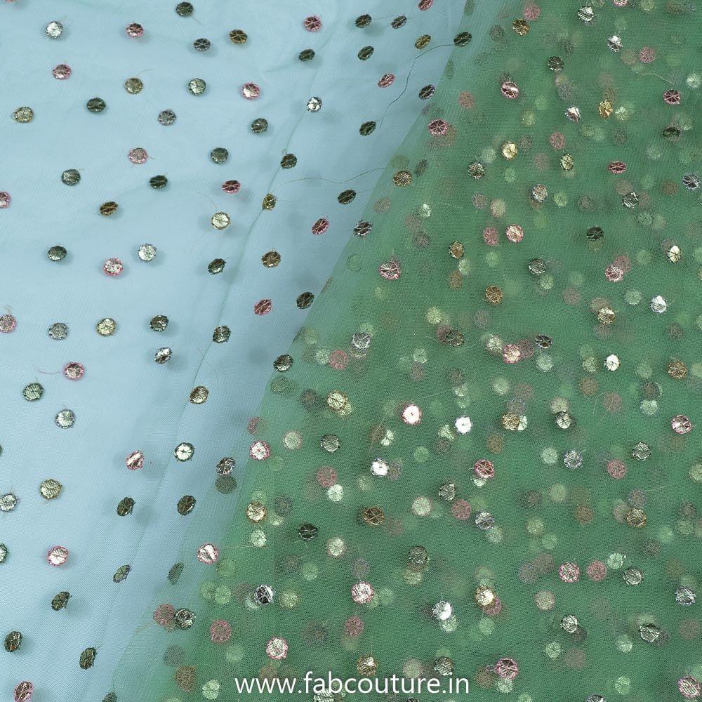 This fabric is from FabCouture Net Embroidery Collection and the base fabric is tulle net with a scattered sequins embroidery. It is good for dupattas, lehengas and sarees. SKU: 100212063
