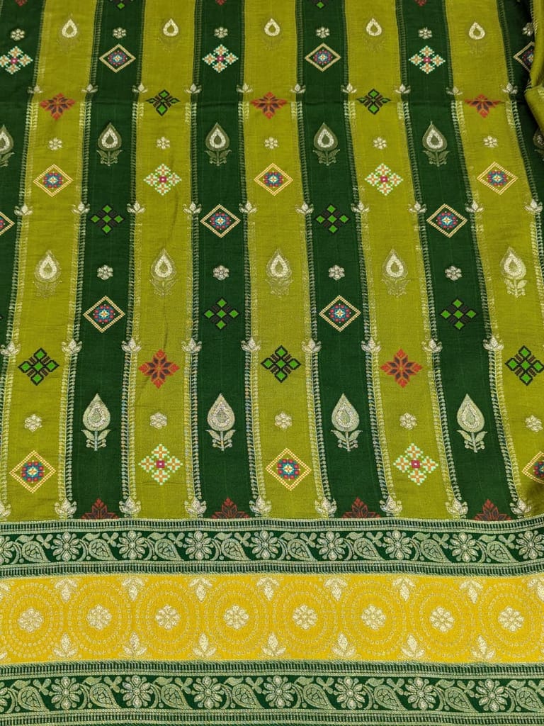 The fabric features a vibrant color palette, primarily dominated by various shades of green, including dark forest green and lighter, more yellowish-green or "mehndi" green vertical stripes. These stripes are interspersed with intricate traditional motifs in colors like red, white, and blue, and accented with metallic gold or yellow threading, particularly noticeable in the border. The lower border section is a bright, solid yellow with detailed gold patterns, providing a striking contrast to the green body of the fabric.