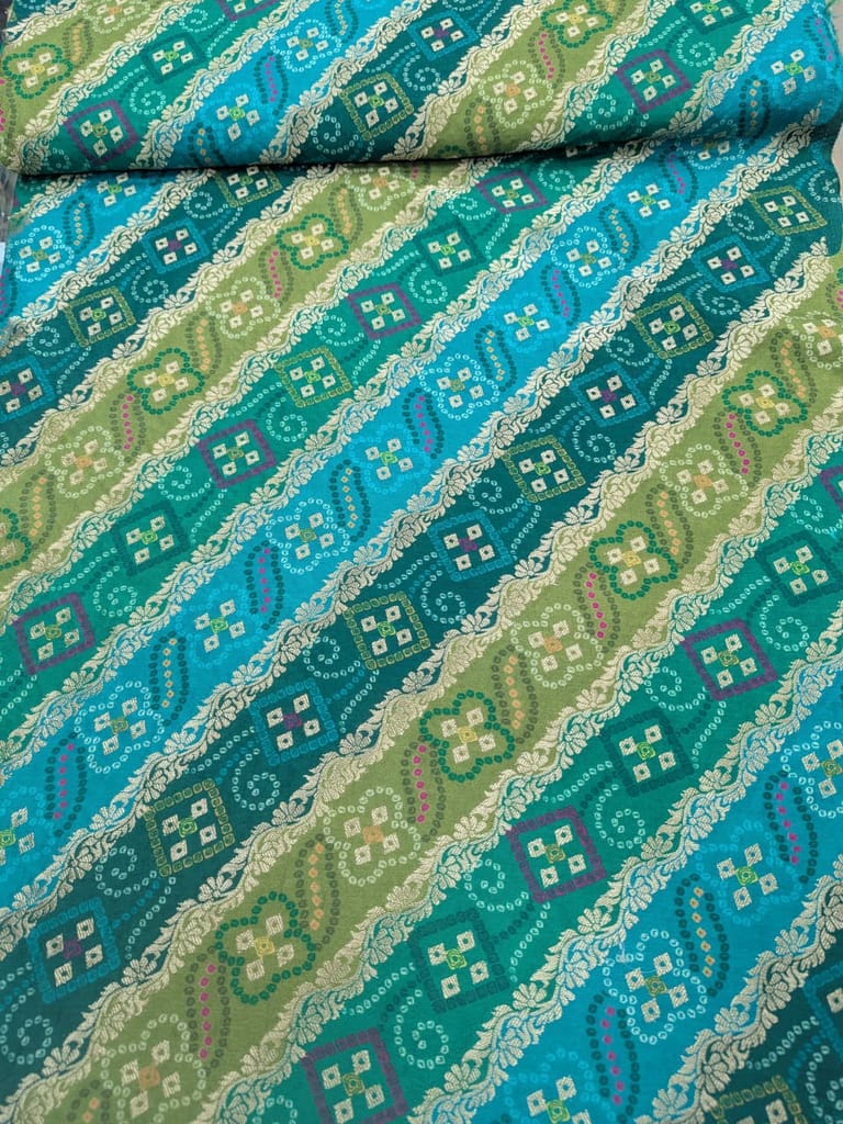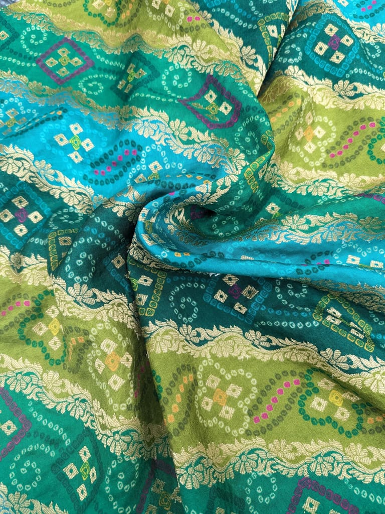 The fabric is a vibrant, multi-colored material featuring a mix of green, blue, and teal hues arranged in diagonal stripes. The specific shades range from light lime green to deep emerald green, and from bright turquoise to a deeper teal or aqua blue. Within these stripes are traditional Indian 'bandhani' or tie-dye patterns, characterized by small dots and squares. Elegant golden motifs, jacquard work, run along the borders of the stripes, adding a rich, ornamental touch to the design.