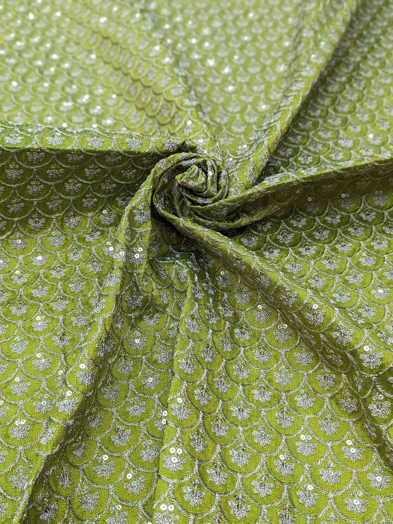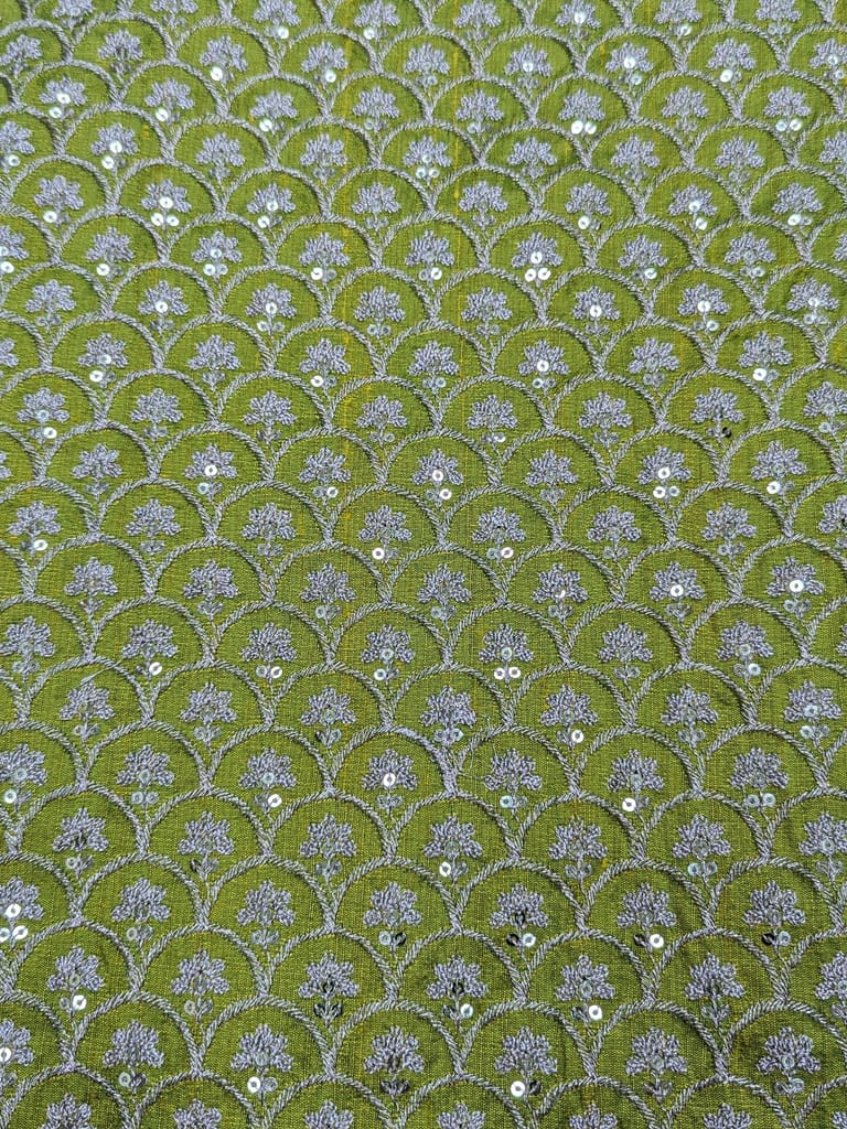 This fabric is a green-colored material featuring a dense, ornamental or geometric & floral pattern in a lighter, contrasting silver zari work. The intricate, interlocking design gives it a visually rich texture.