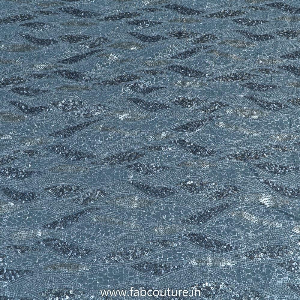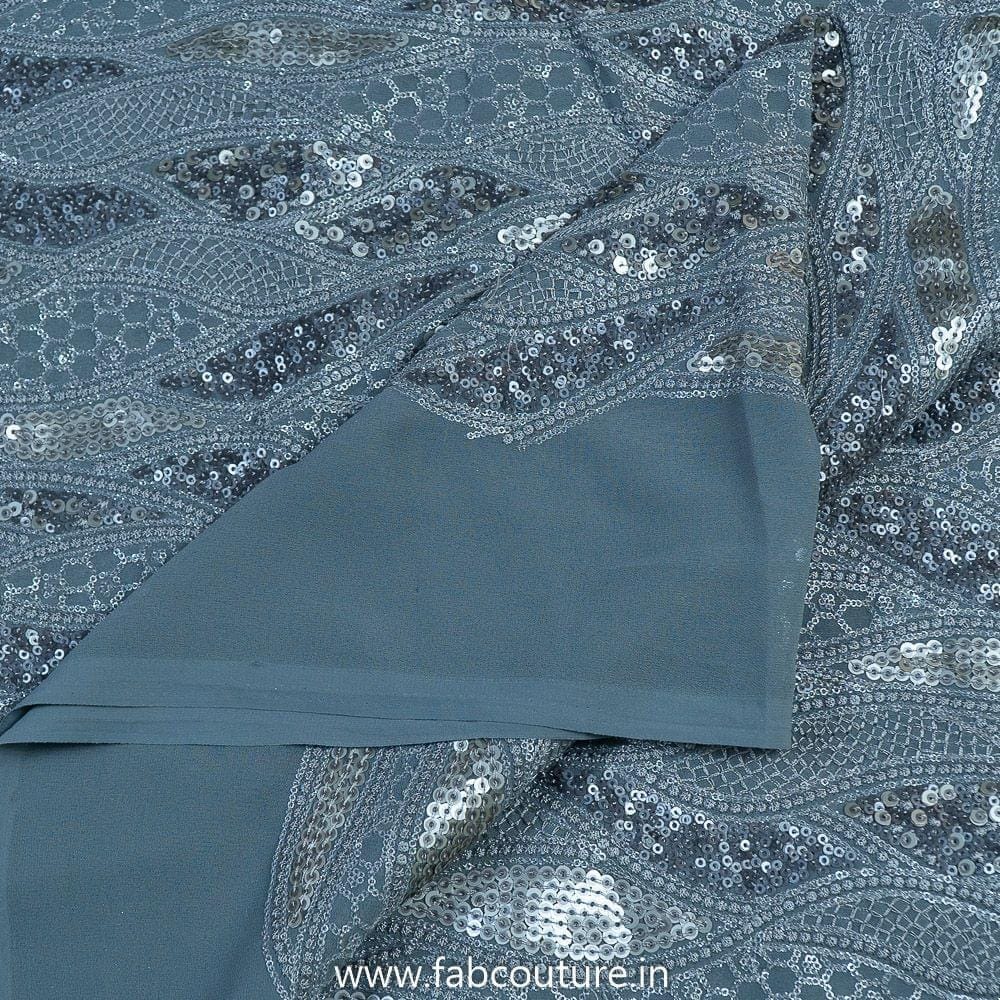 This fabric is from FabCouture Embroideries Collection and the base fabric is grey poly georgette which has been embellished with a beautiful pattern of sequins in an abstarct yet distinct form and is best for blouses, lehengas, cocktail gowns, short western dresses and the like. SKU:100212917 GEO EMB D.NO 2880L