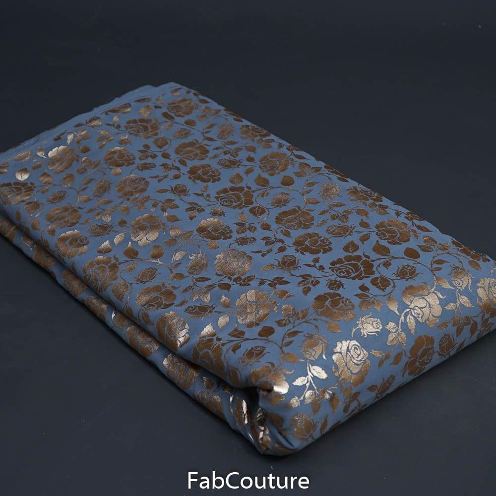 Grey Colour Georgette Foil Floral Print ,This georgette fabric is sheer, flowy and has an excellent fall which makes it best for sarees, dresses, draped silhouttes, plazzo pants, blouses and tops. The foil print is the cheery on top which makes it dressier. SKU: 10021596