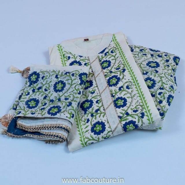Hand Block Cotton Printed Suit With Cotton Sharara And Cotton Dupatta Stitched Suit Set. This is from FabCouture Sharara suit collection and the fabric is pure cotton with hand block print and has been stitched to fit size L. The dupatta is in pure cotton and is printed and has gota detailing. SKU: 100211017 DNO-0194A